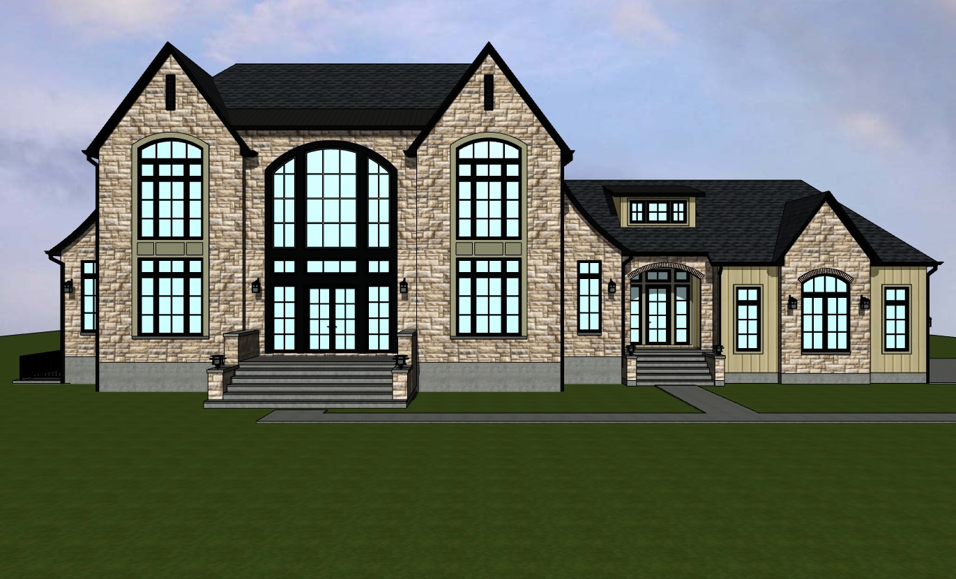 modern european home large earth tone stone black window frames black gutters and downspouts black shingles with black metal roof accents