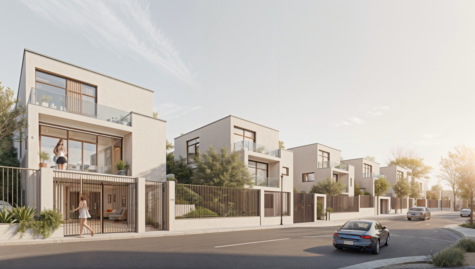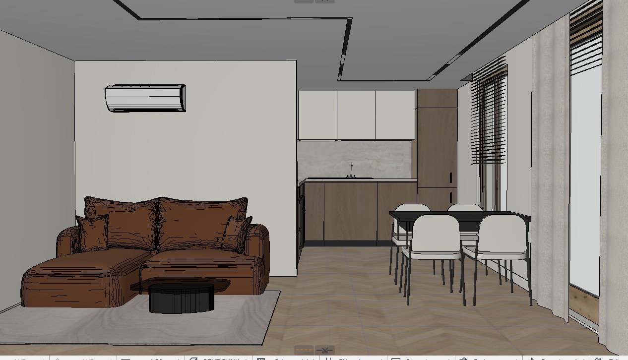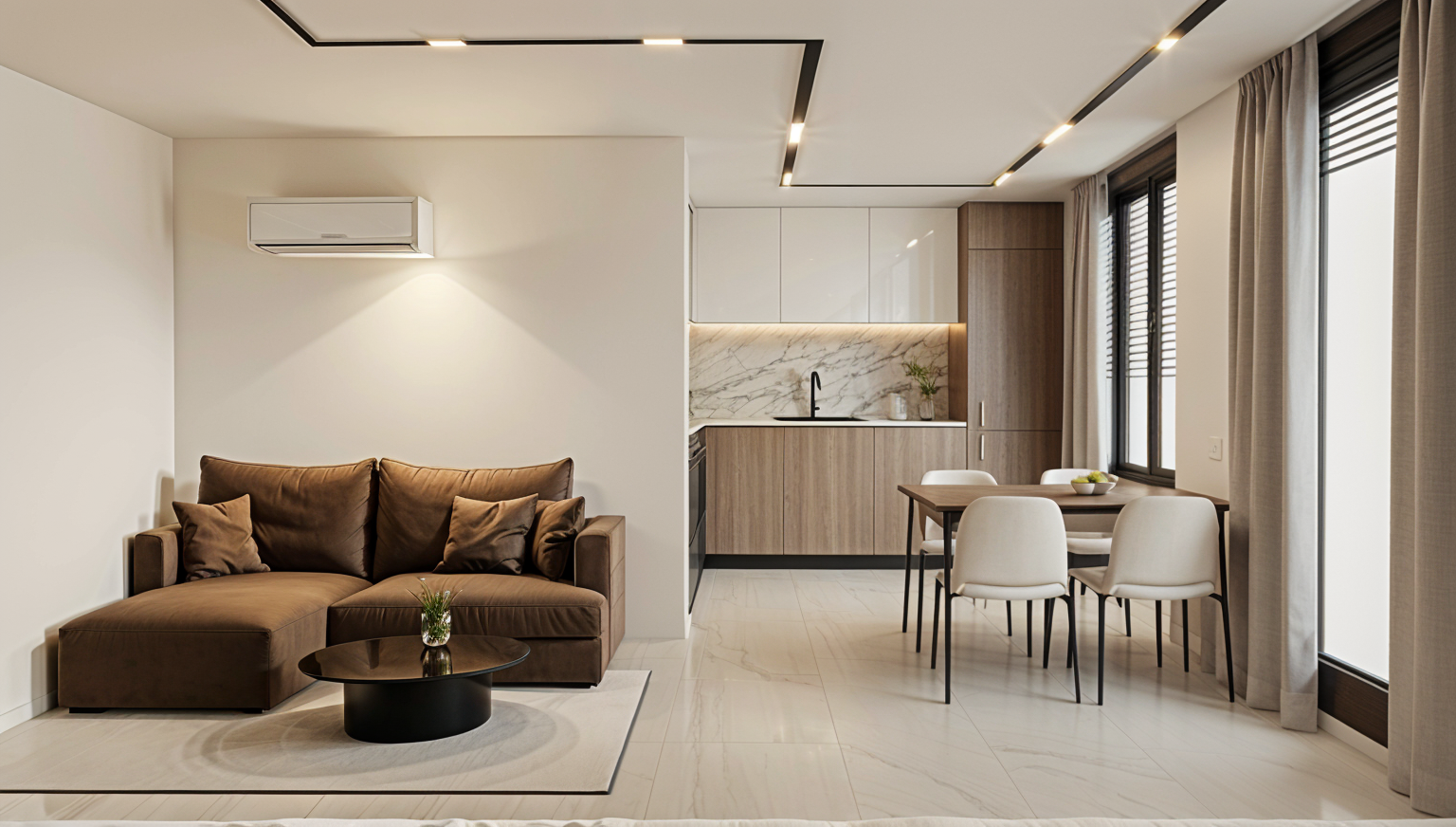 render a beautifully cozy modern living room with a warm atmosphere the walls should be a soft light cream providing a neutral backdrop the sofa is a rich warm brown but material not leather accented with matching cushions place a sleek black round coffee table in front of the sofa the curtains and floor are soft beige complementing the light wood flooring kitchen cabinets have a natural wood finish with white upper cabinets the dining chairs are elegant cream with black legs surrounding a minimalist black table add warm ambient lighting whit balack konstruction to create an inviting and relaxing atmosphere the window blinds are black which harmonizes with the soft warm lighting throughout the room flor is a littele darker wood than kitchen the wall between the cabinets in the kitchen is more of a beige stone there is air conditioning on the wall it has crayons the same color as the wall