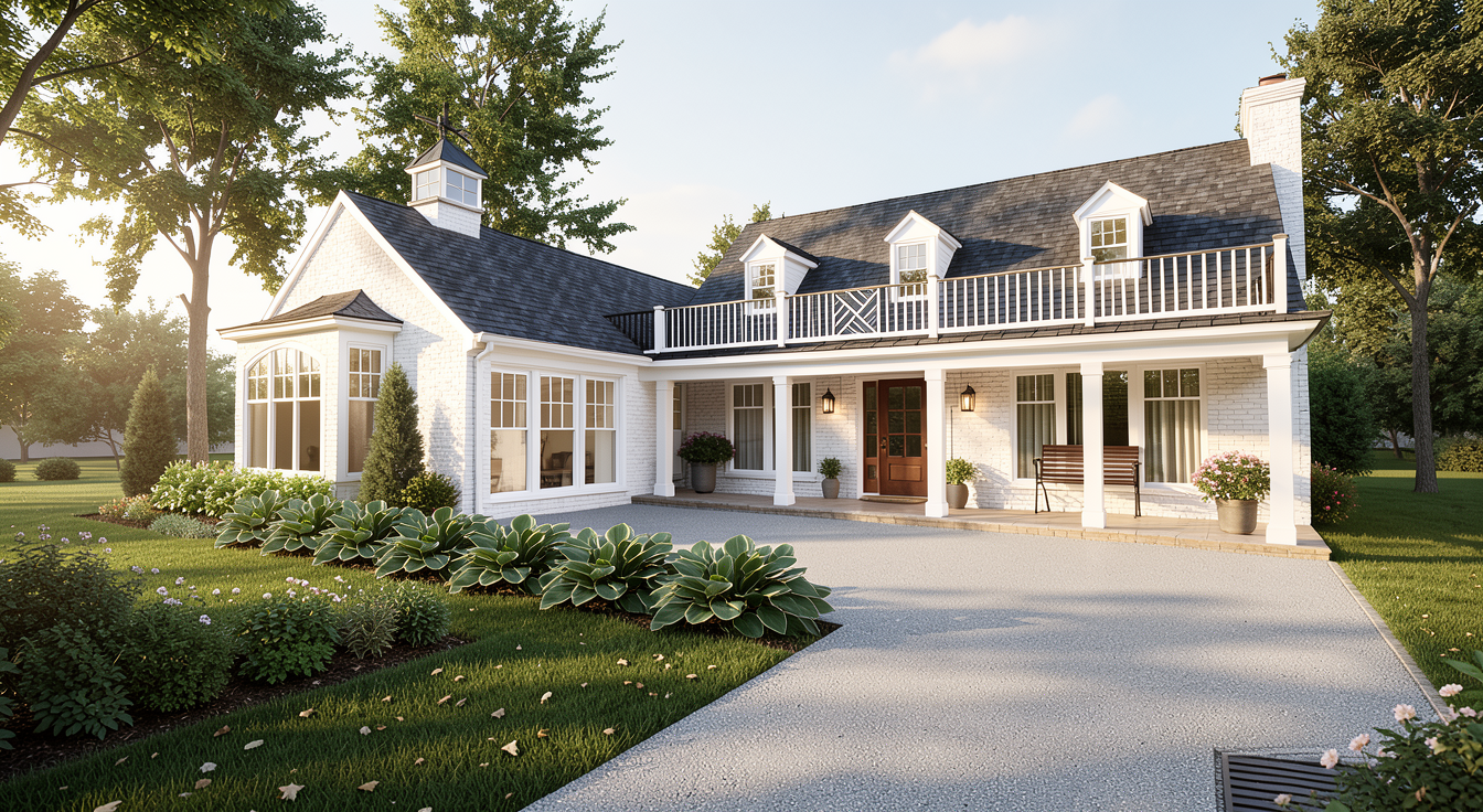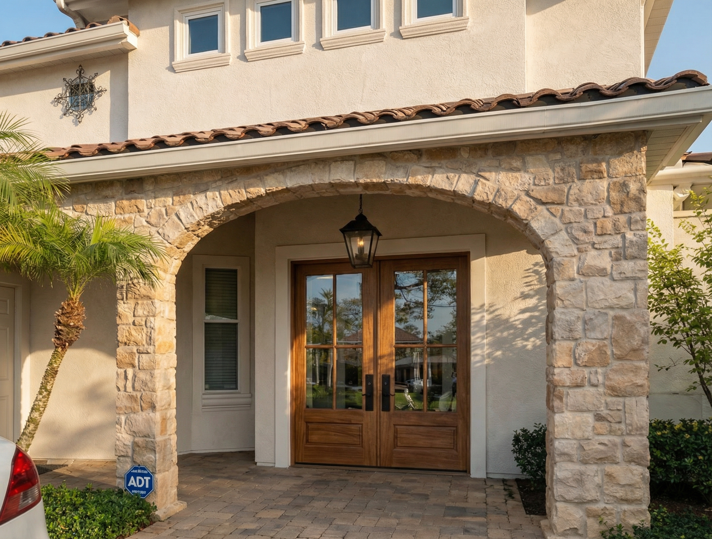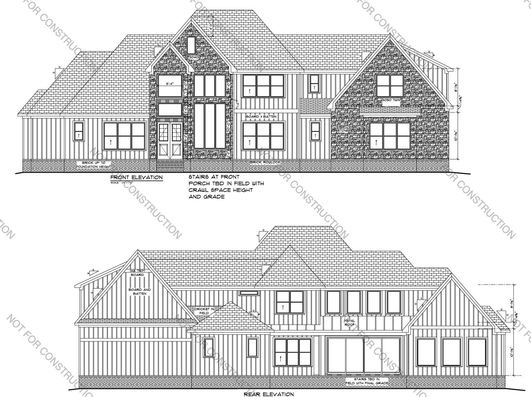 this house has a black roof black trim black windows the base brick is bright white the stone portions are an off white the board and batton is white as well