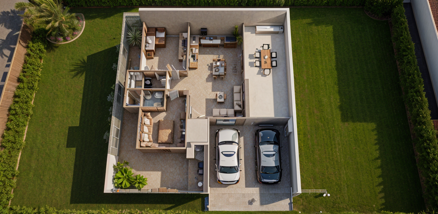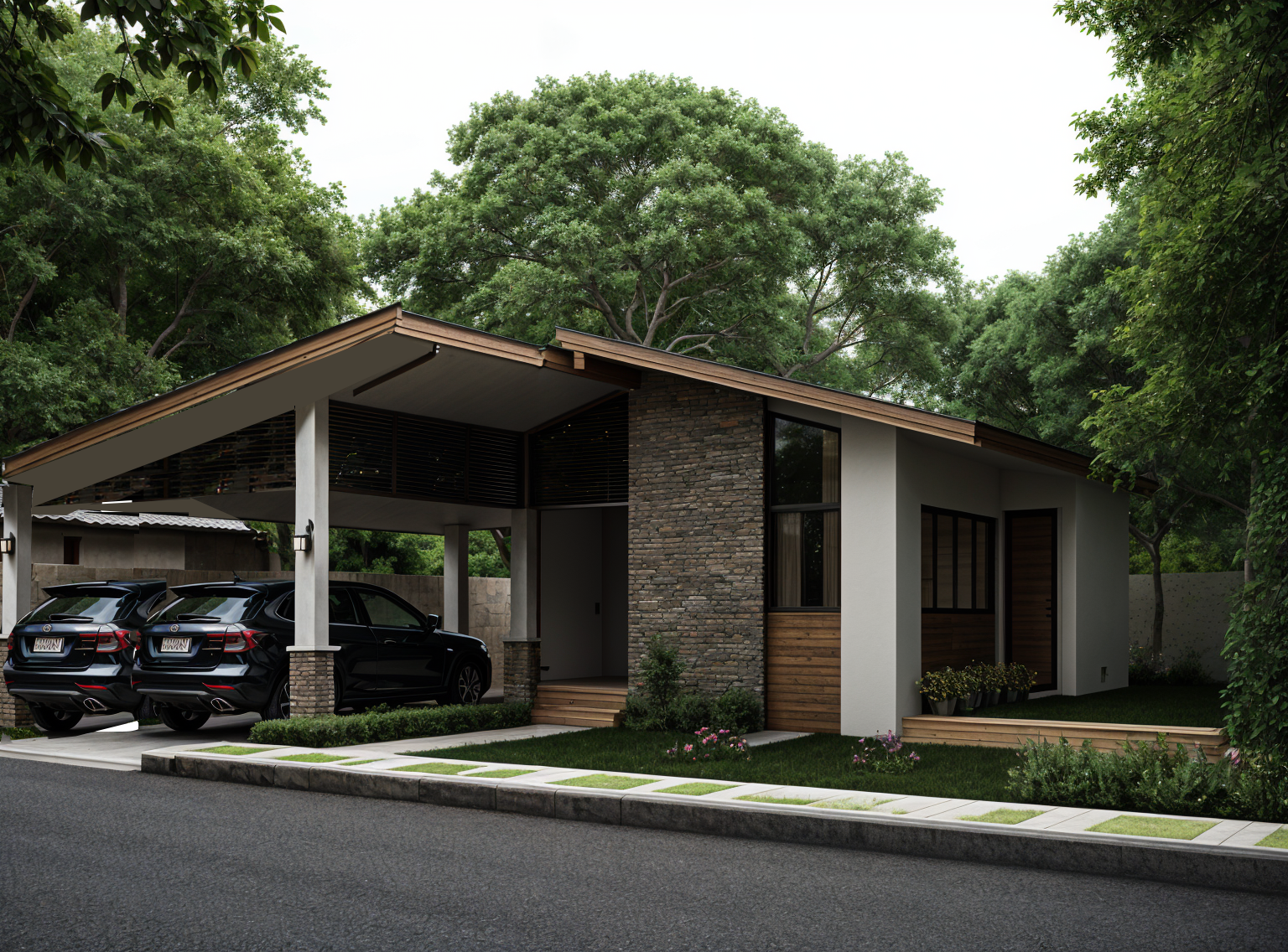 refine this image of a modern tropical house with a two car carport keep the same materials stone cladding white painted walls and wooden accents but enhance lighting and realism adjust the roof alignment and edges for cleaner lines and ensure both vehicles fit naturally under the carport with correct shadows and reflections improve grass texture plant detail and add subtle highlights to the pathway and fa ade maintain the same overall composition angle and environment realistic daylight soft shadows and balanced contrast