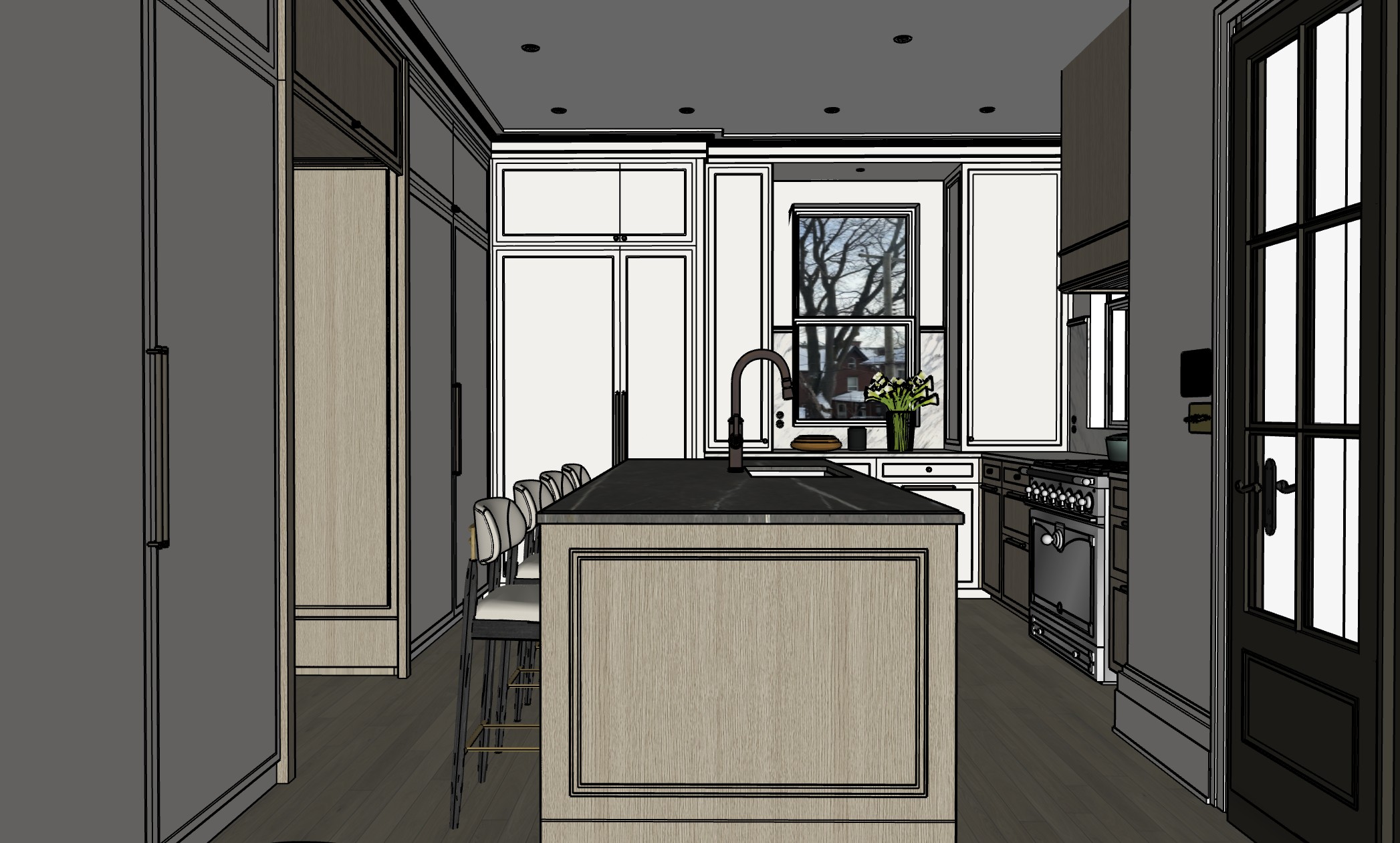 put the ceiling white put the backsplash the same counter as the island put the wood floor a rich beige