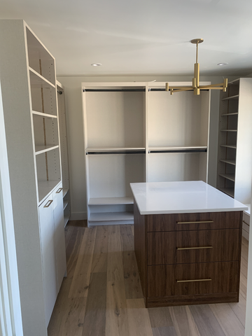 do not change the cabinets in any way preserve the exact cabinet colors materials finishes dimensions door and drawer styles hardware spacing alignment and all geometry exactly as shown do not alter the countertop shape backsplash appliances flooring lighting fixtures or wall structure only remove the construction materials clutter and mess from the scene clean the room and make it look finished and staged add a few simple tasteful home accessories appropriate for the style of the space but do not add or remove any furniture windows or architectural elements maintain the original lighting direction and realism enhance clarity and polish the photo while keeping the cabinetry and room design completely unchanged do not alter the lighting to keep the cabinet colors as they are in the image clean up the dust on the top restage for a luxurious master closet turn on the lights hang clothes on the black closet rods