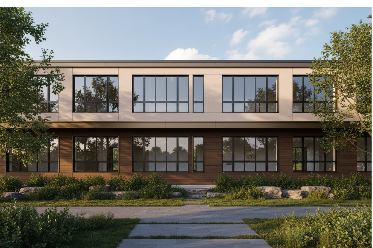 beaux arts night shot medireranean village background olive trees and aloe veras and thujas in garden french interiors in windows brass vertical stripes railings rolf benz furniture brass window frames white facade grey pieces of facade change to brass white marble pavement shining blue mosaic pool in front of every balcony two randomly distributed floor to floor vertical striped brass panels 80 by 320 cm architecture