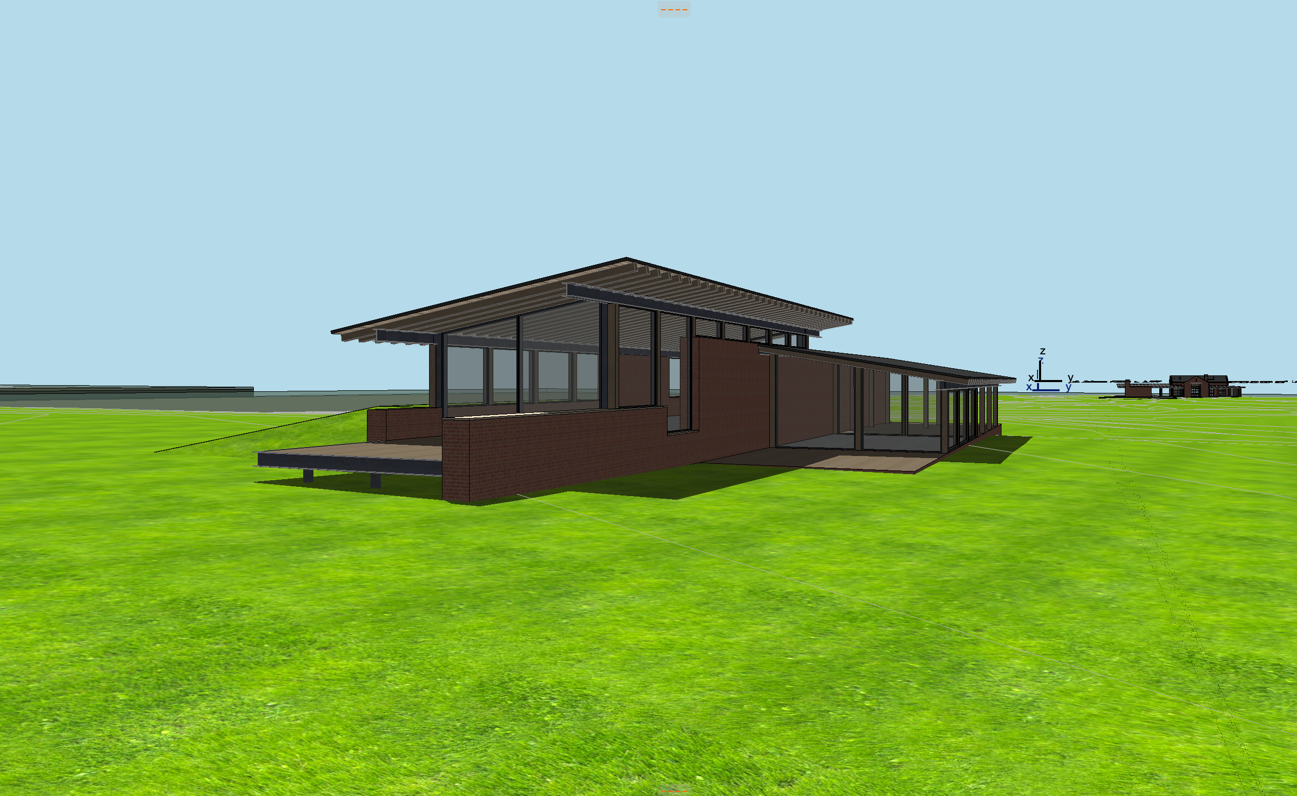 landscape to be that of south louisiana wild native grasses and tress lake in the background with the opposite shoreline in the far off distance evening time lighting with soft glowing light coming from inside the home materials to be antique brick timber steel and a standing seam roof