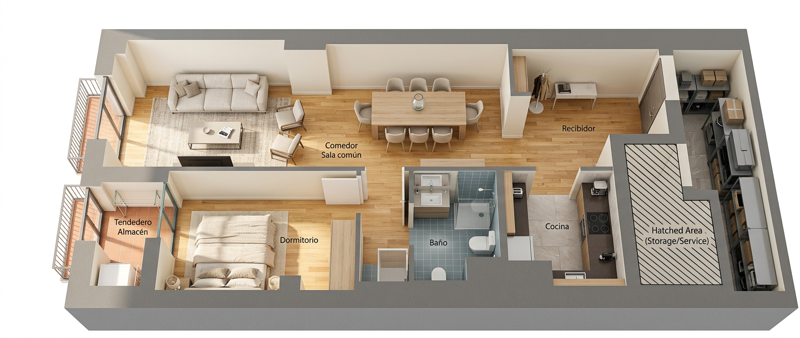 convert this floor plan into a realistic isometric 3d view of a full house show the space from an elevated angle with furniture walls and details visible dise a el interior como un apartamento moderno minimalista y elegante estilo interior minimalismo contempor neo de inspiraci n n rdica materiales y colores paredes blancas detalles en negro madera natural clara roble o similar suelo de madera c lida incluye mobiliario realista colocado seg n el plano a ade algunos elementos decorativos discretos plantas l mparas sencillas y mobiliario minimalista ba o blanco c ete exactamente a los muebles y formas del plano la imagen final debe parecer una visualizaci n arquitect nica limpia elegante y muy ordenada con un estilo moderno y acogedor use the same furniture as shows on the plan do not change the orientation of the floorplan