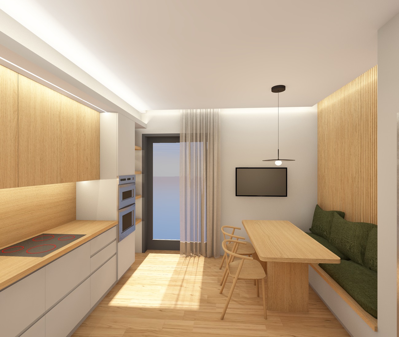 make the render more realistic add sunlight from the existing window outside that window there is an athenian city view make the picture brighter