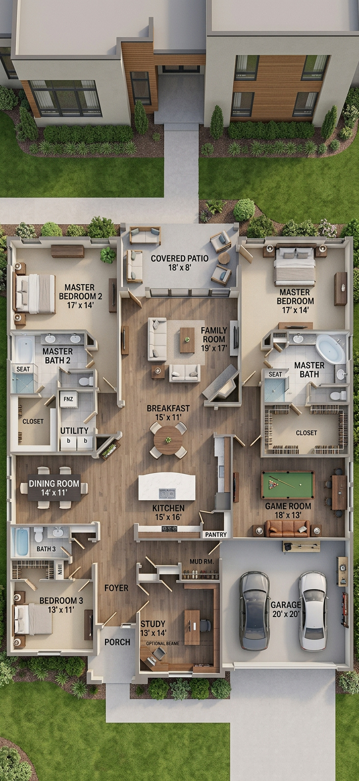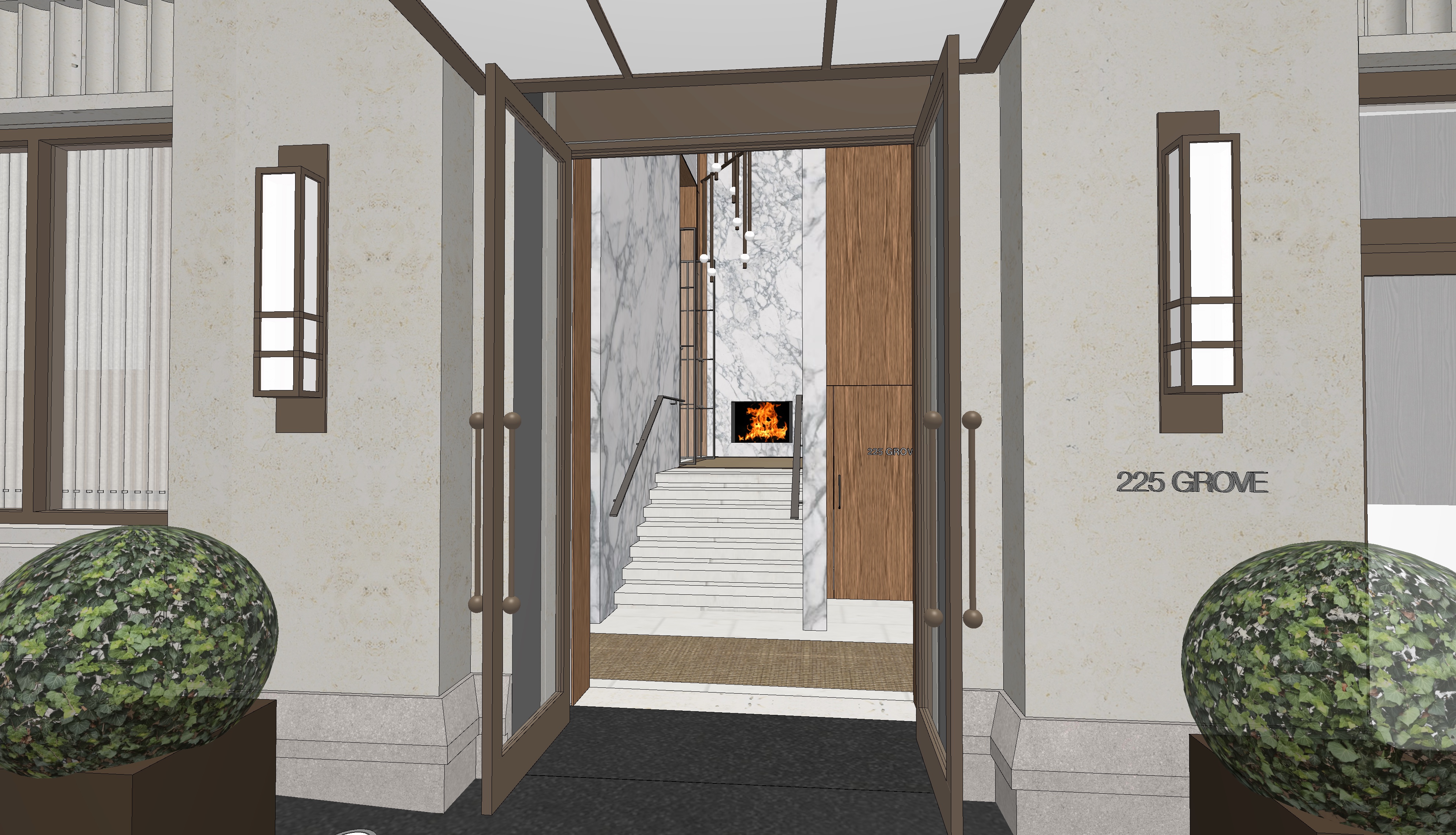 render a modern entranceway with an open door leading to a limestone staircase flanked with marble walls soft ambient lighting emphasizes two vertical wall sconces in brushed bronze the walls are textured stone in a warm beige the staircase leads to a cozy fireplace flames flickering warmly set against marble walls add light walnut wood paneling on the left wall for a sophisticated contrast on the sides place lush green potted topiary with realistic foliage creating a welcoming atmosphere the door frames and handles are a dark rich bronze the atmosphere is inviting elegant and serene the 3 white ceiling panels are backlit with warm dim light each stair tread is illuminated with a linear light