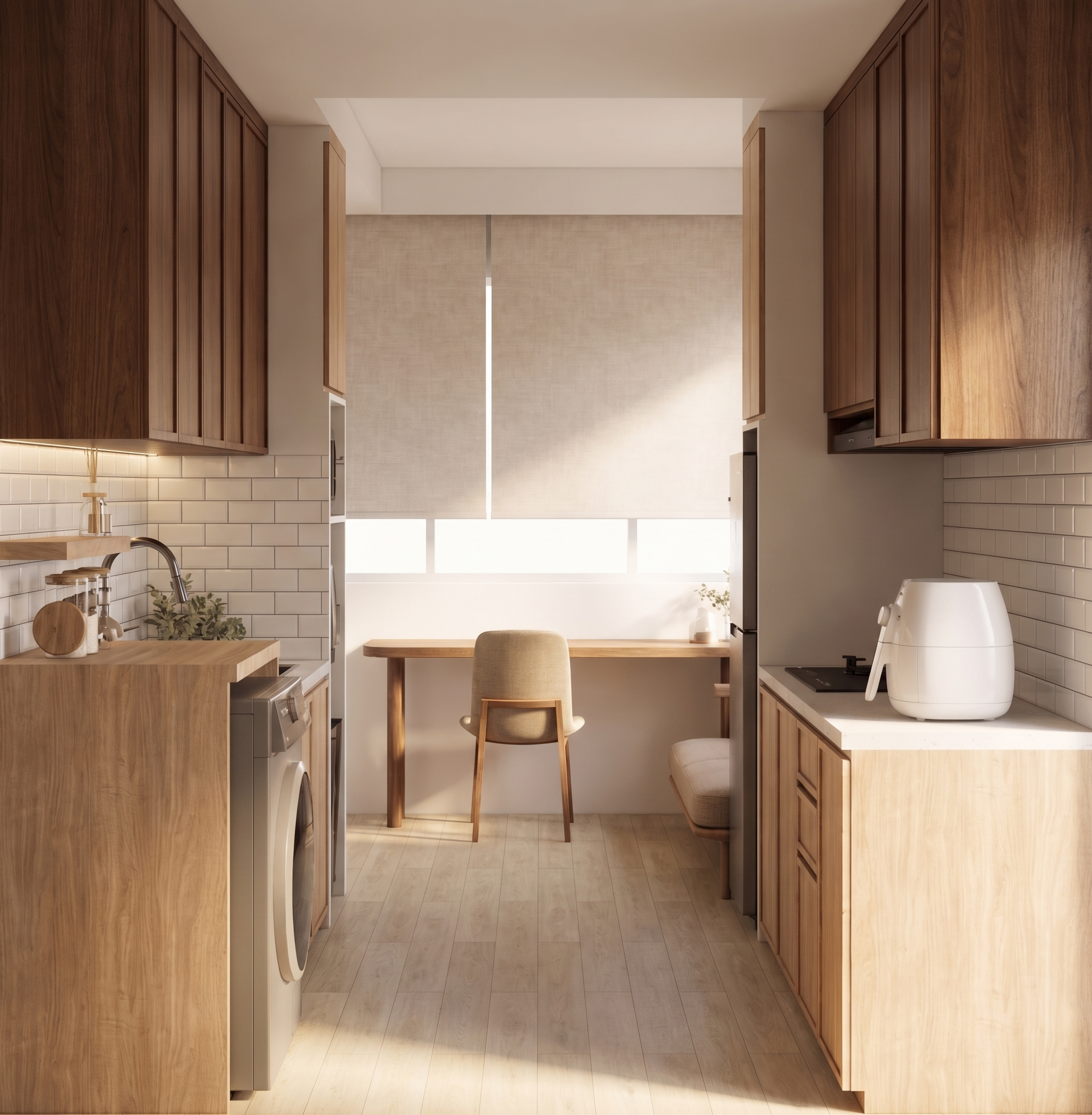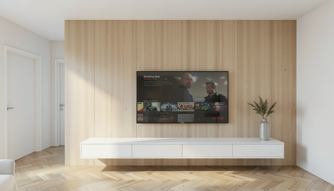 superrealistic rendering of living room with daylight light shaddows sideboard material oak chippboard egger hamilton h3303 st10 led stripe light on the top of hanging cabinets and on botton and make less gaps between the doors