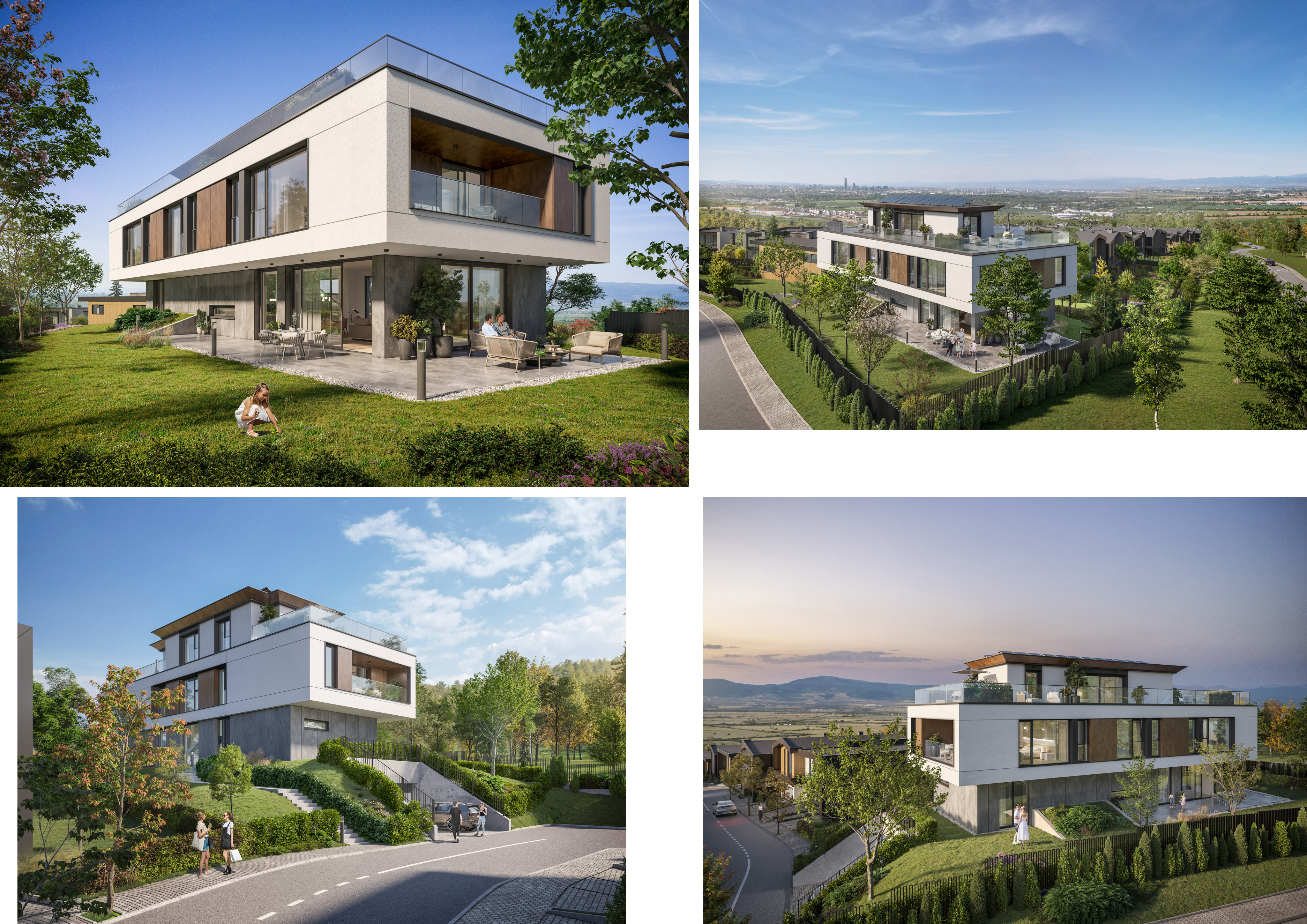 exterior shot straight vertical perspective use the materials and environment from the mood board use the same outdoor furniture like in the moodboard put some people