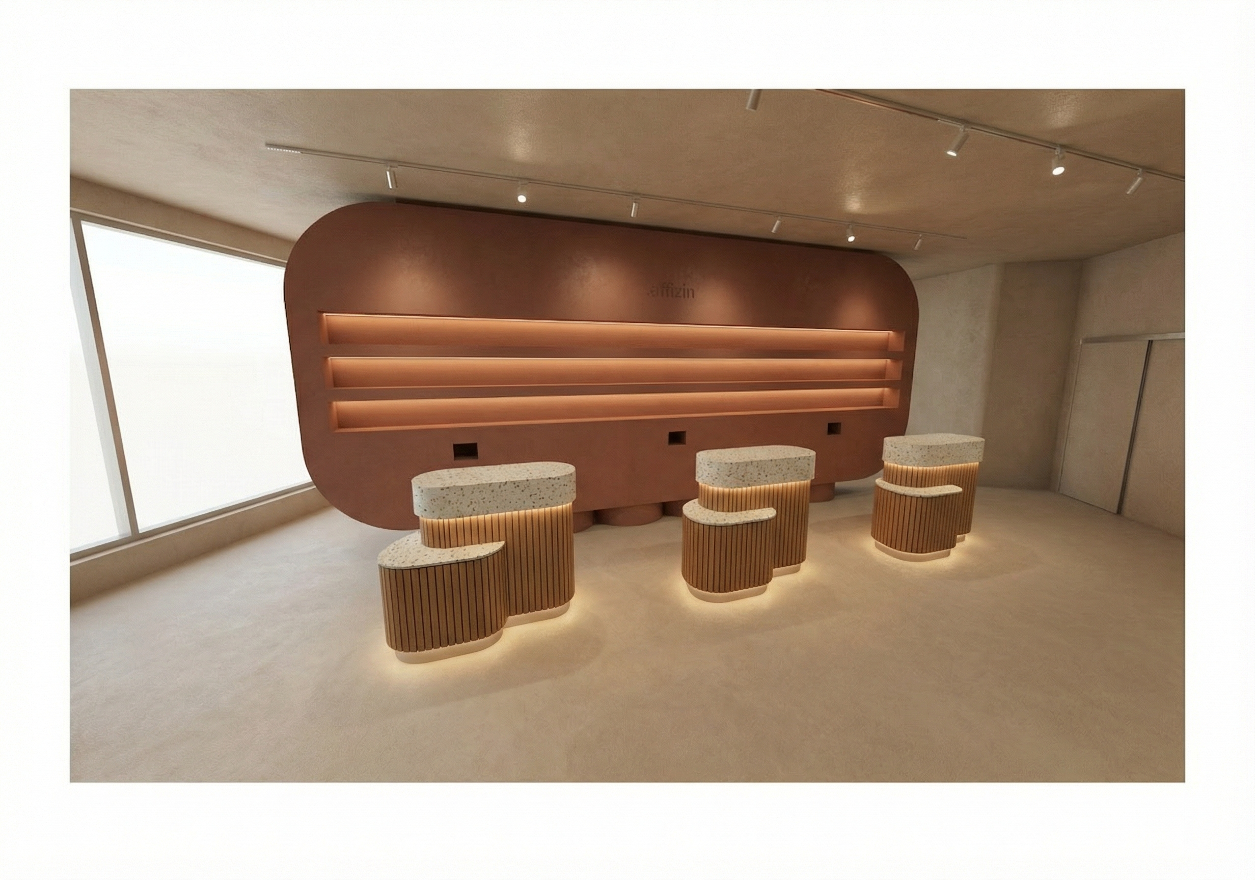 refine the existing interior render without changing geometry layout or camera position apply a fine microcement texture to all walls ceilings and floors matte and subtly irregular add soft integrated led lighting beneath the terrazzo countertops warm and discreet improve the overall lighting to a balanced professional retail lighting scheme warm calm evenly controlled accent focused suitable for public interiors maintain realistic light distribution soft shadows and natural material depth no redesign no distortion lighting and material realism only