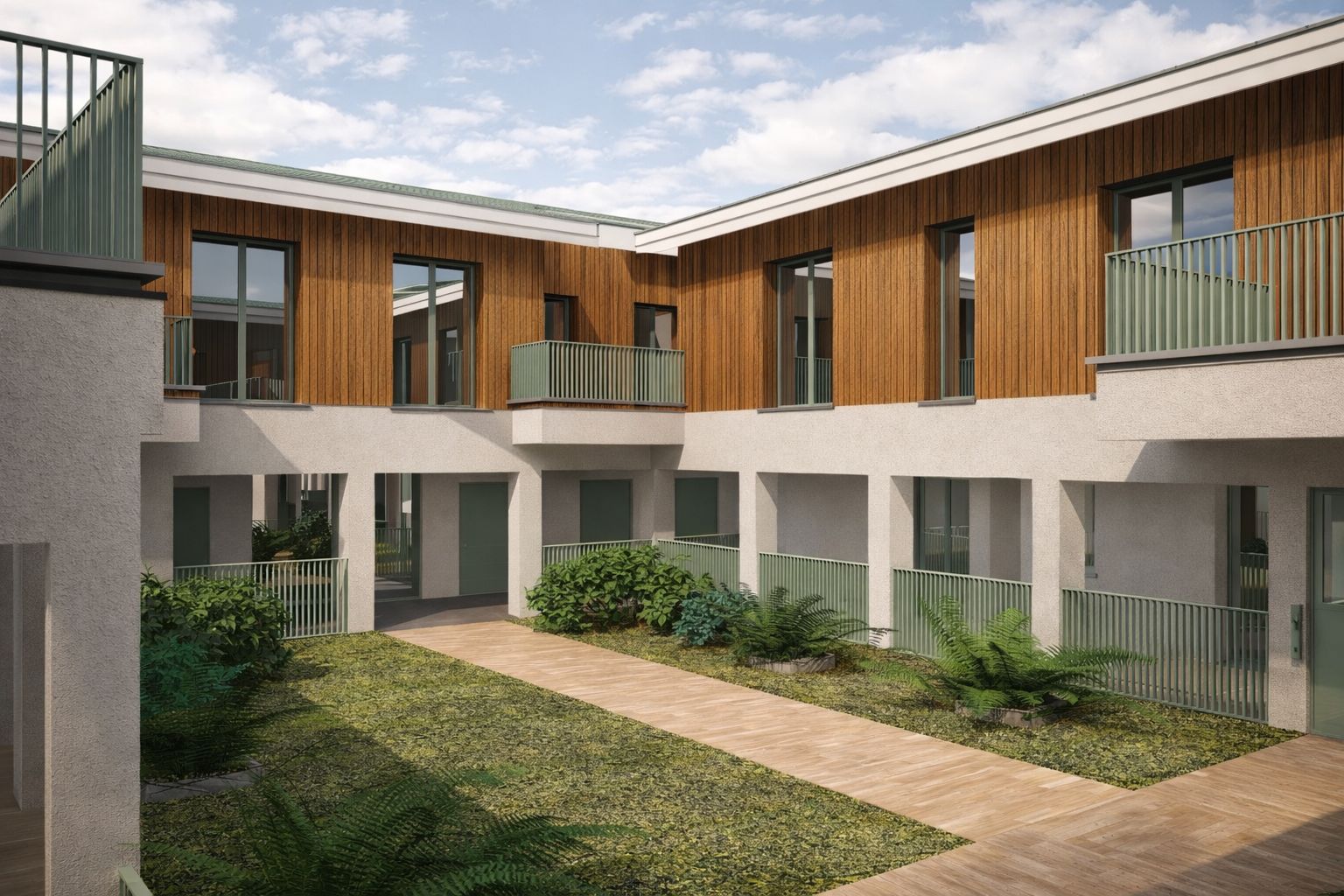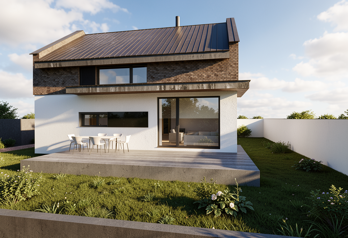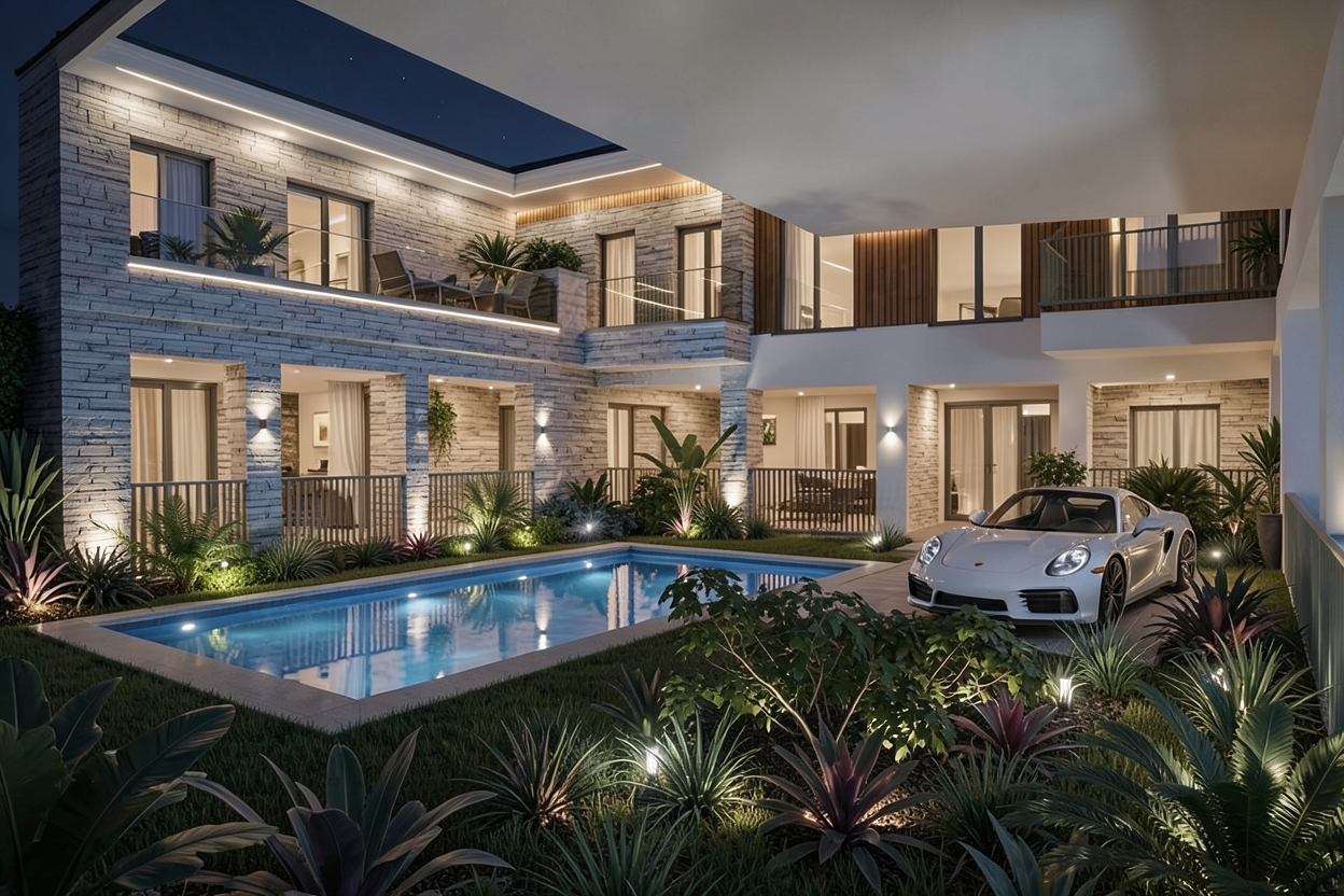 fai un render ambientato in un bel giardino con prato e piante grasse esotiche in aiuole ricercate come design una bella piscina frontistante la villa la villa con intonaco bianco e volumi rivestiti di pietra a listelli orizzontali grigi chiari il parapetto in vetro del piano primo del terrazzo e una biserie in legno a doghe verticali sotto la loggia del piano primo fai uno scenario notturno aggiungendo dei corpi illuminanti nel giardino con creazione di luci a spo difusse in un gioco di luce e ombra ed evidenziando le facciate della casa con strip led e qualche faretto