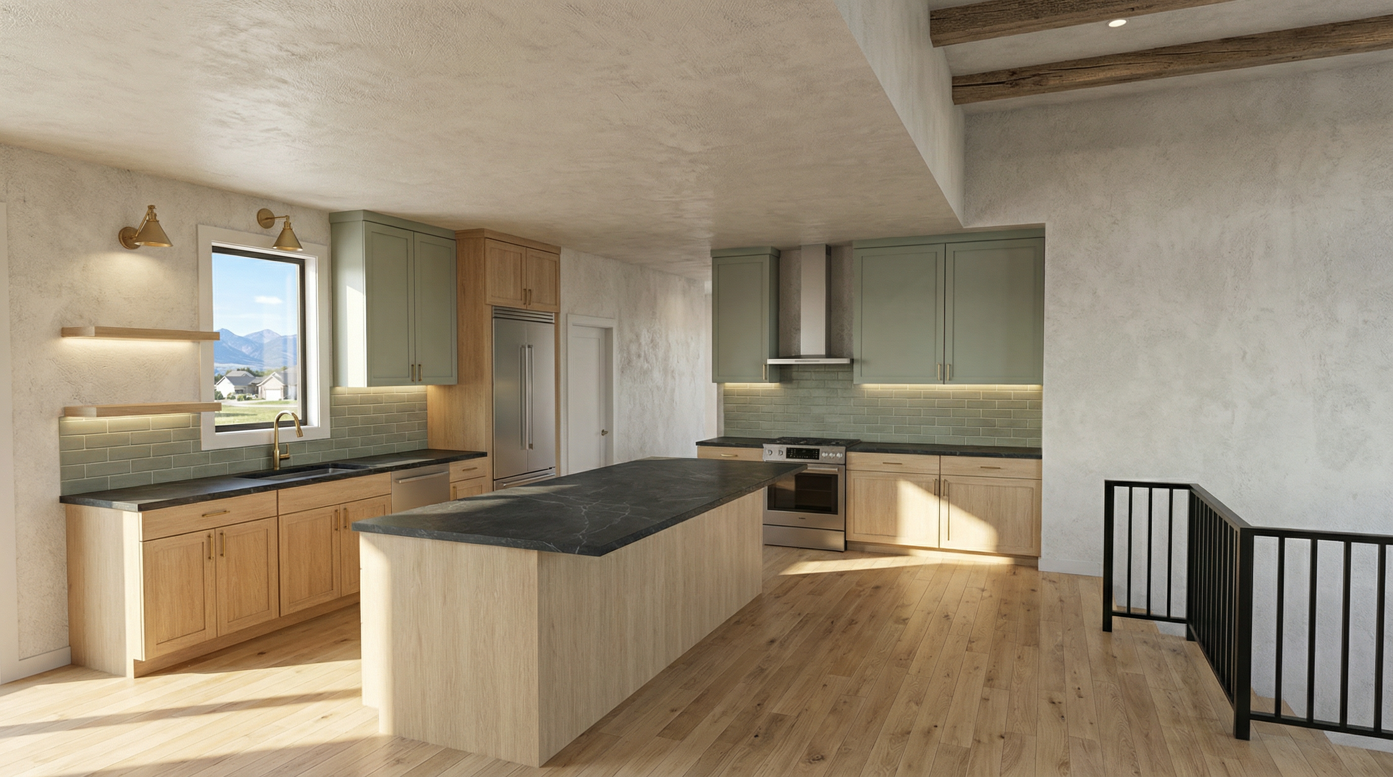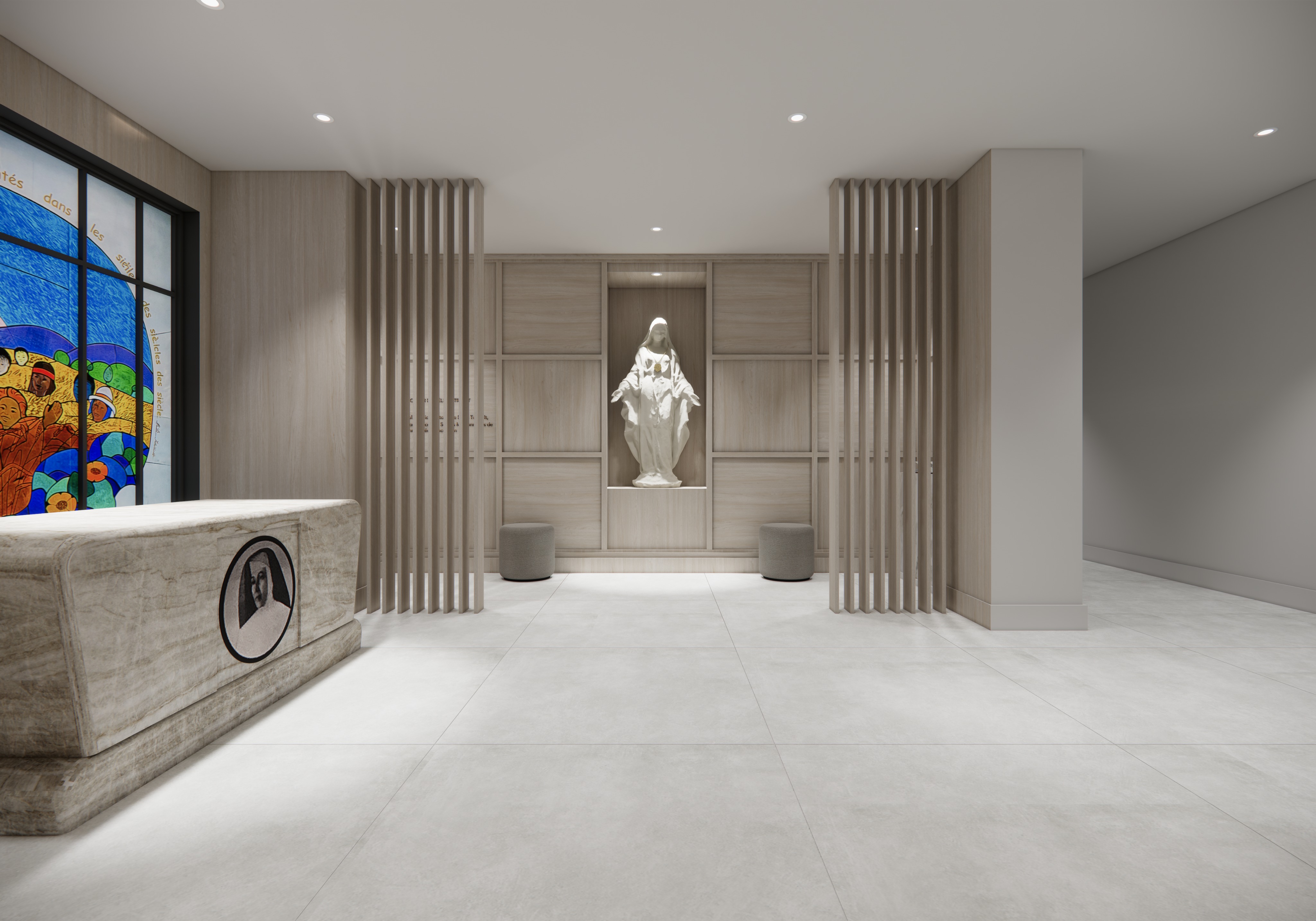 create a render in hyper realistic architectural visualization quality 8k resolution all objects furniture and architectural features must remain in place do not add any objects or delete anything from the image and let natural light in through the stained glass window on the left