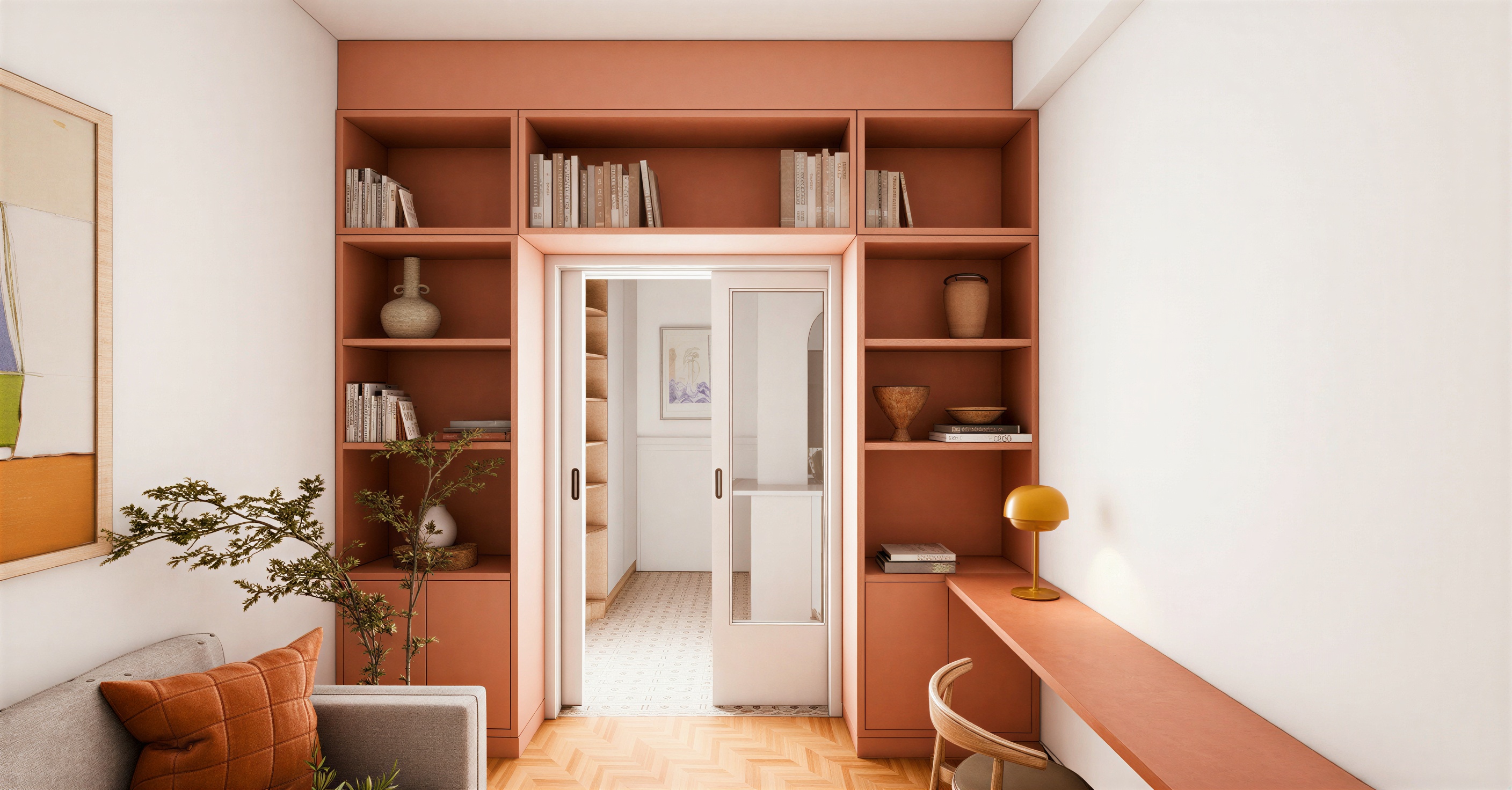 we are in the same apartment the floor of the living room is wood parquet the shelves and desk are mat lacquer in terracotta color from benjamin moore code pumpkin patch 055 the walls are off white please keep all geometry and material as it is