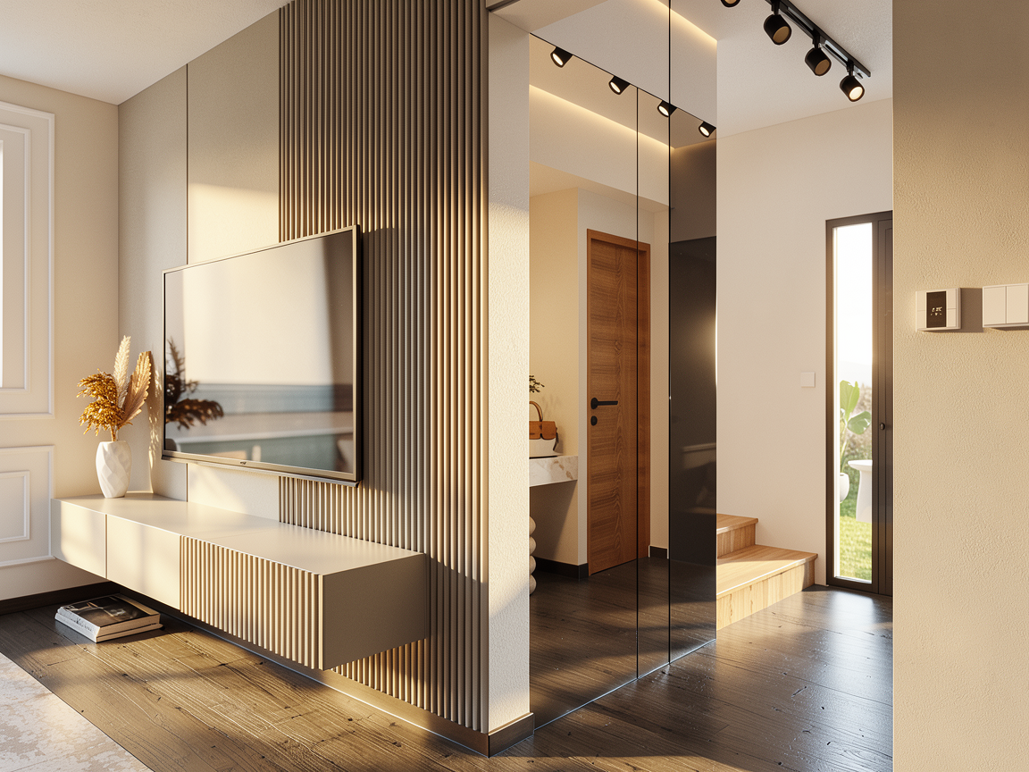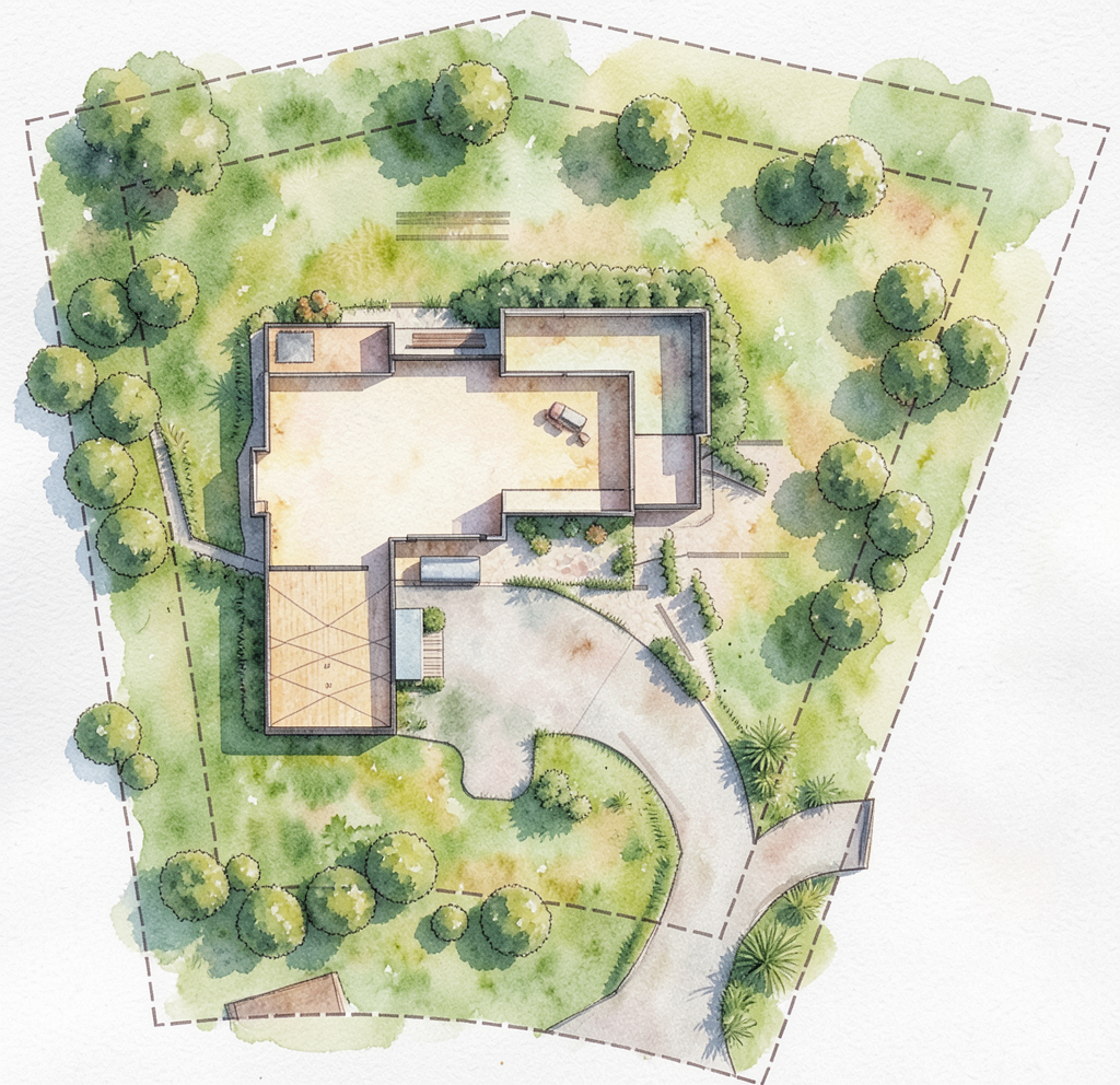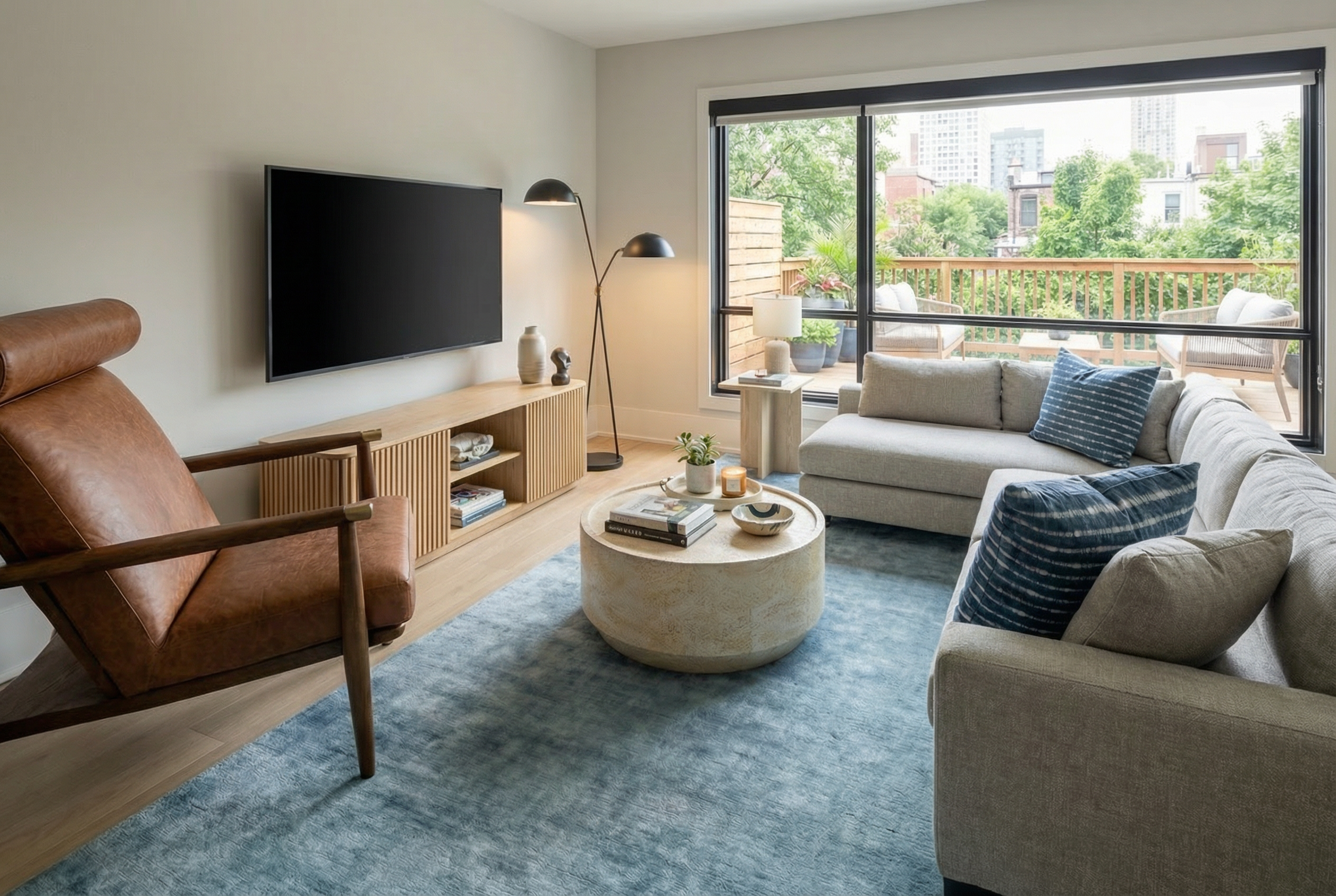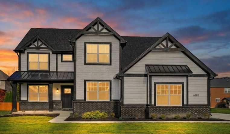 white brick light gray siding and trim make the background and open field with trees