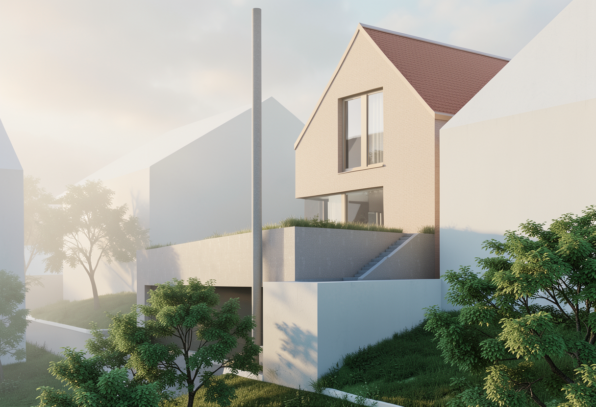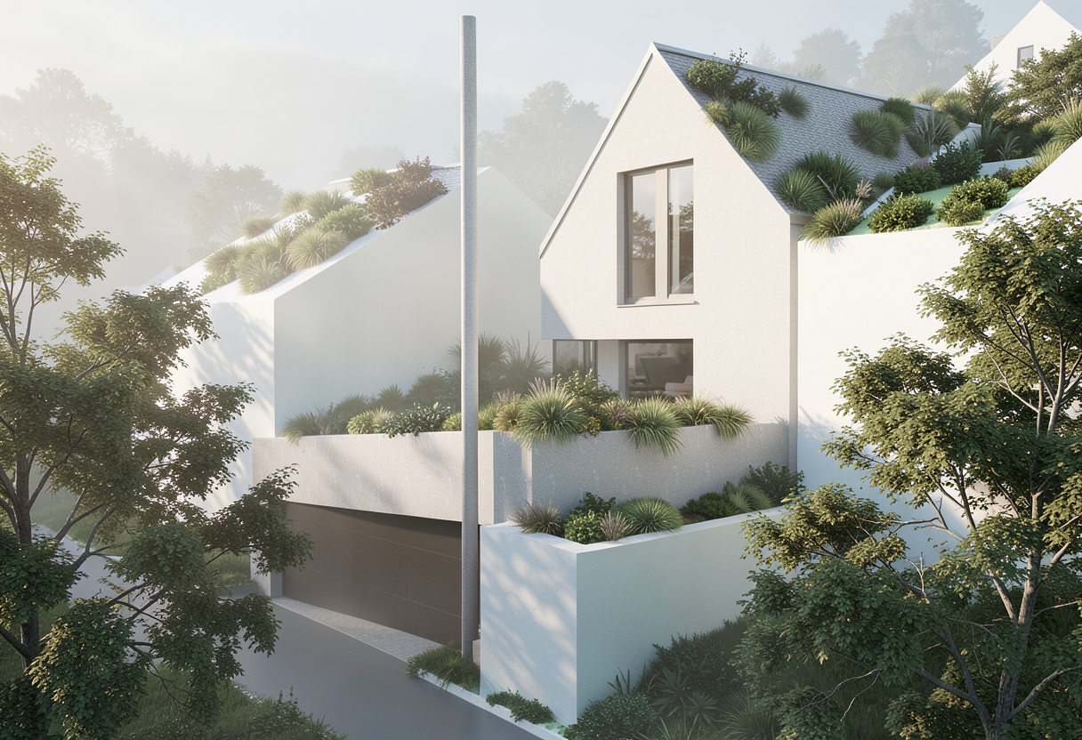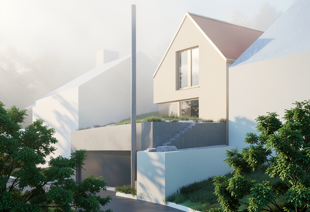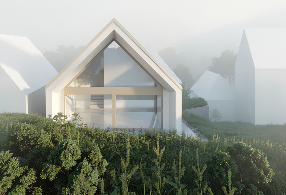create a photorealistic architectural visualization of the provided scene from an elevated aerial viewpoint preserve all original materials colors lighting fog and the overall atmosphere of the scene exactly as they are enhance the composition by adding realistic trees in the foreground naturally integrated into the scene without altering the original design intent maintain high material accuracy realistic light behavior in fog soft shadows and a professional architectural visualization style do not change the mood weather conditions or environmental atmosphere of the scene