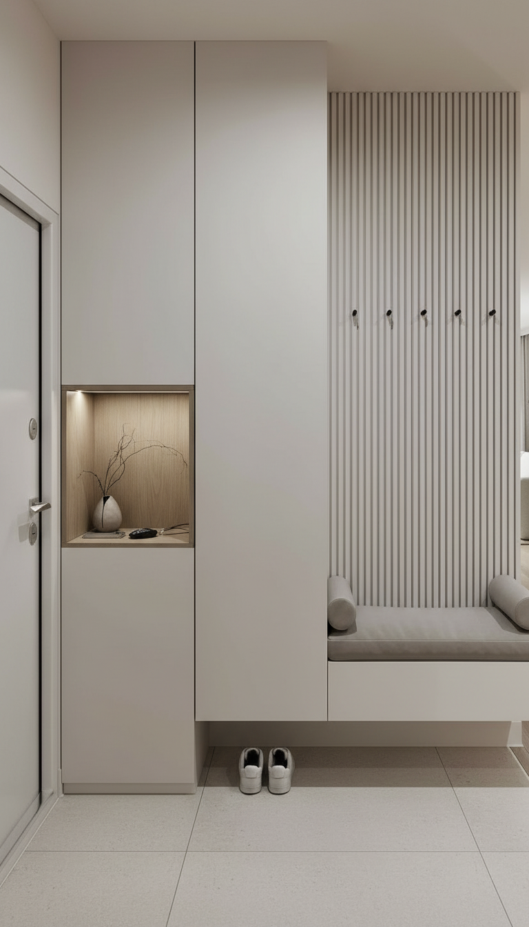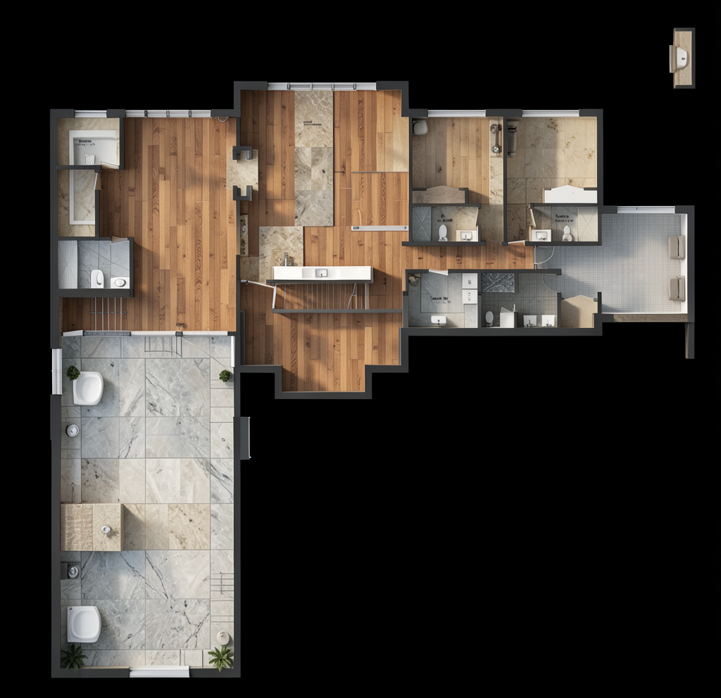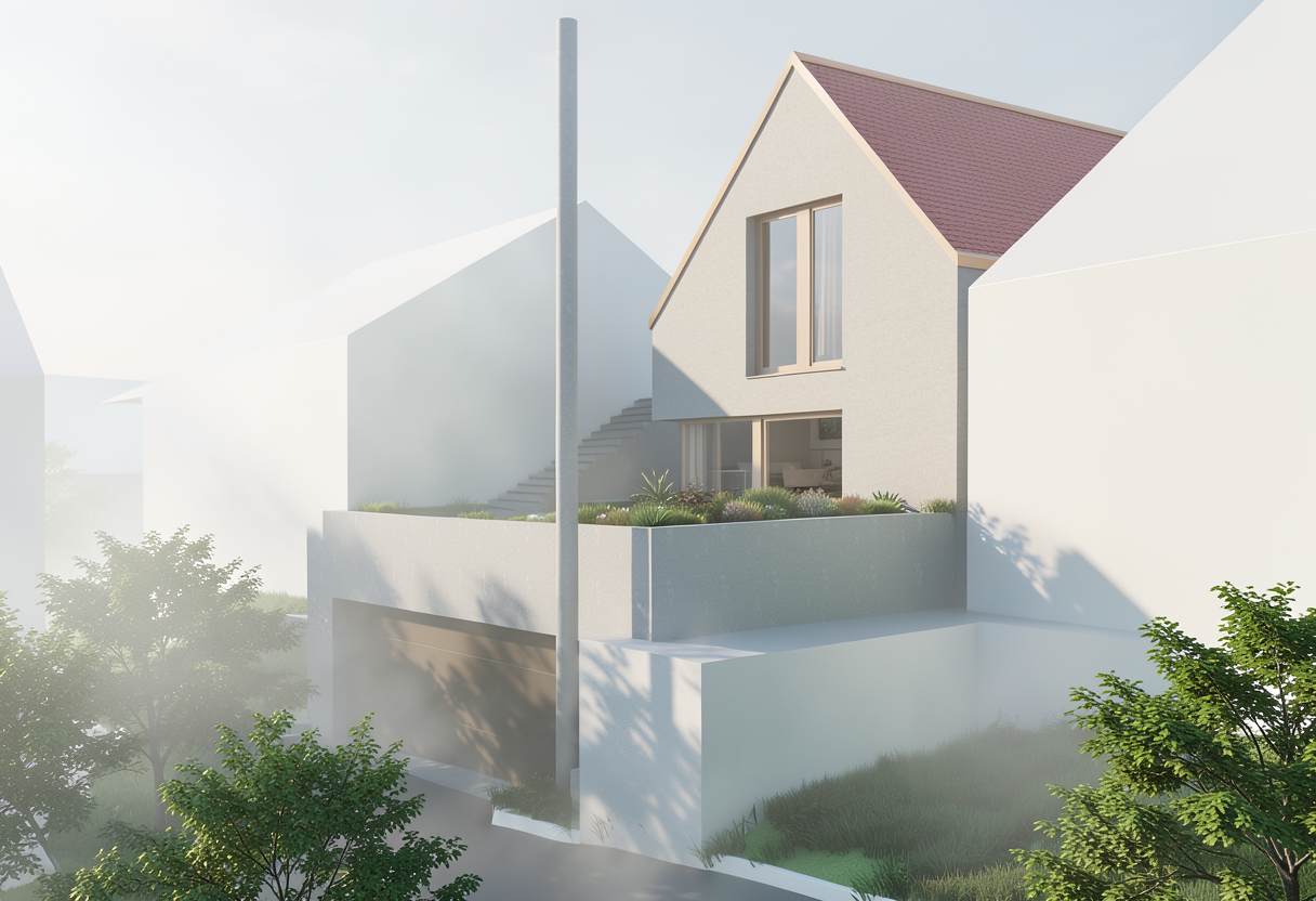 create a photorealistic architectural visualization of the provided scene from an elevated aerial viewpoint preserve all original materials colors lighting fog and the overall atmosphere of the scene exactly as they are enhance the composition by adding realistic trees in the foreground naturally integrated into the scene without altering the original design intent maintain high material accuracy realistic light behavior in fog soft shadows and a professional architectural visualization style do not change the mood weather conditions or environmental atmosphere of the scene