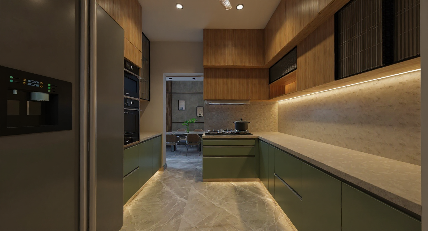 create a realistic interior render showcasing the existing furniture and flooring with their original textures preserved exactly as provided provide illumination for the light fixtures and under cabinet lights retain the marble flooring texture