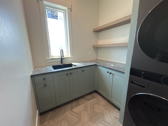 do not change the cabinets in any way preserve the exact cabinet colors materials finishes dimensions door and drawer styles hardware spacing alignment and all geometry exactly as shown do not alter the countertop shape backsplash appliances flooring lighting fixtures or wall structure only remove the construction materials clutter and mess from the scene clean the room and make it look finished and staged add a few simple tasteful home accessories appropriate for the style of the space but do not add or remove any furniture windows or architectural elements maintain the original lighting direction and realism enhance clarity and polish the photo while keeping the cabinetry and room design completely unchanged do not alter the lighting to keep the cabinet colors as they are in the image stage this as a beautiful serene laundry room with a beautiful view outside the window