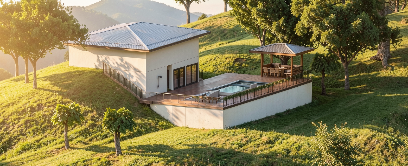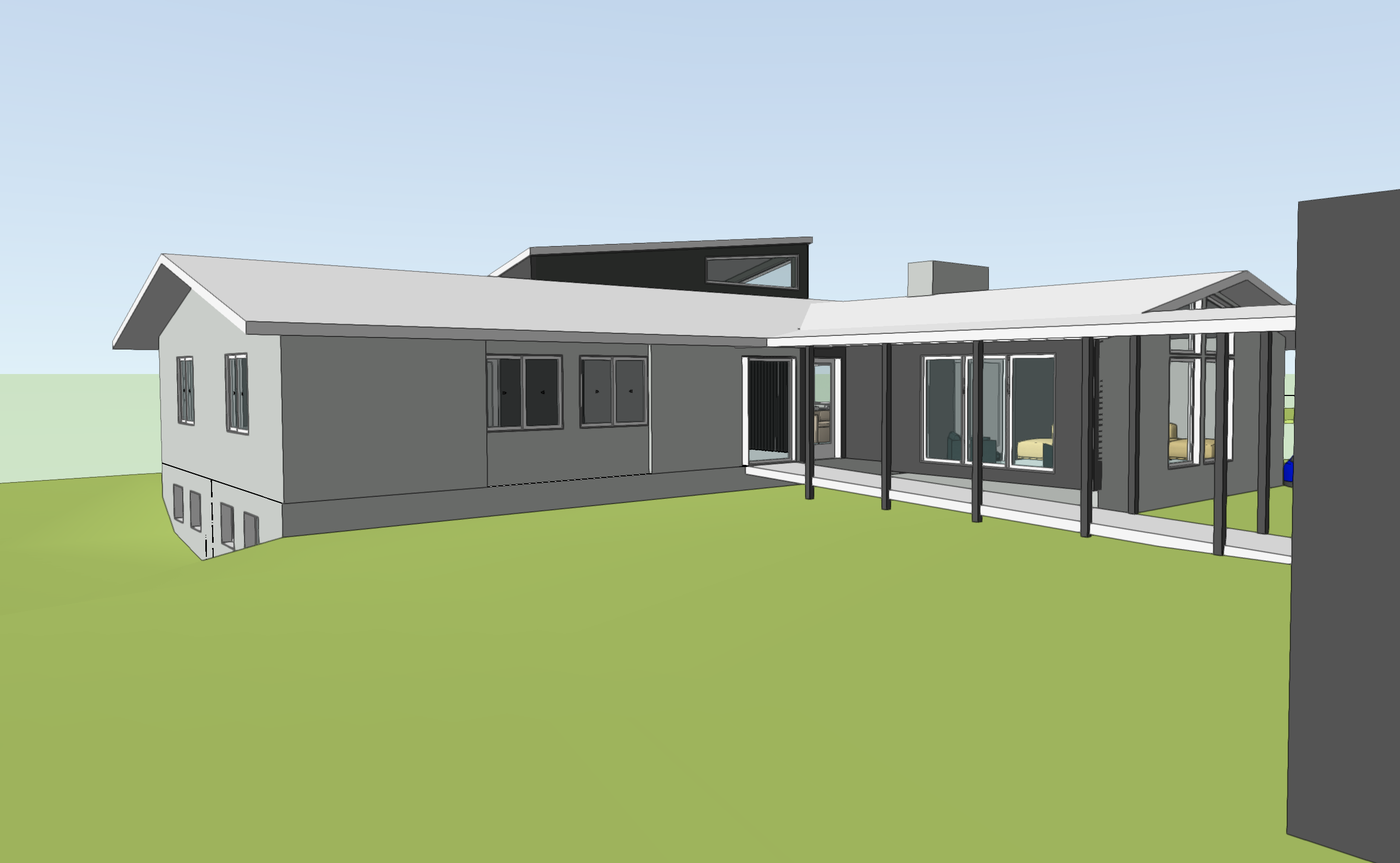 vertical wood slat siding the covered walk should be like a japanese engawa black asphalt roof shingles create a japanese garden in front of entrance along length of entrance ramp with gravel and plants do not create new walkways do not add stone anywhere else black windows warm sun foreground building is garage with similar wood slat siding chimney is stone do not change perspective do not change massing do not add roof to garage add some trees in background do not change perspective of image bright afternoon sun hitting house