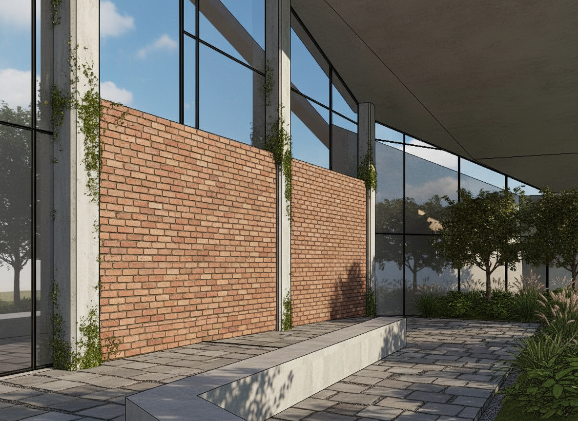 render a modern architectural interior with large windows and a minimalist design use a warm beige for the walls and floor creating a cozy and calming atmosphere the tall thin pillars and window frames should be highlighted in a muted taupe giving a sleek and contemporary look illuminate the scene with soft diffused natural light streaming through the expansive windows casting gentle shadows across the surfaces add a few green indoor plants for a touch of nature accentuating the tranquility of the space