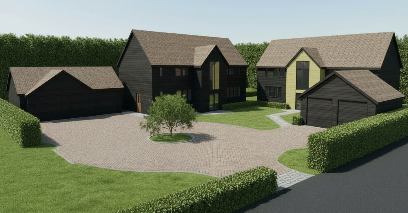 place a tree equidistant to the right and left of the driveway entrance