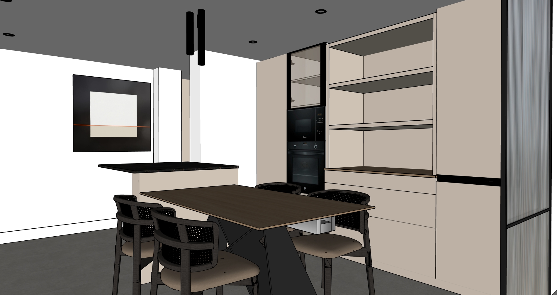 crea una imagen fotorealista en base a esta de sketchup realza texturas y la iluminacion no a adas tanta luz natural los muebles son un poquito mas oscuros