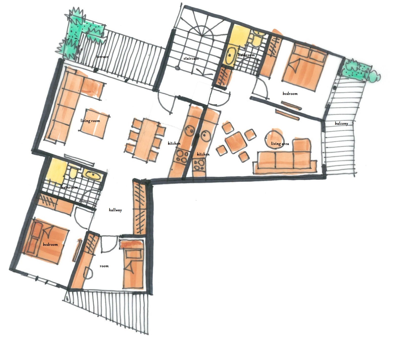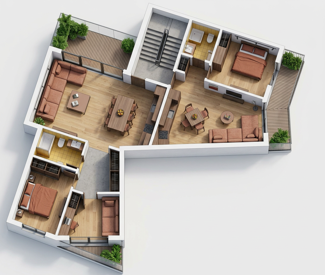 convert this floor plan into a realistic isometric 3d view of a full house show the space from an elevated angle with furniture walls and details visible two modern apartments minimalist gray tones color interior use the same furniture as shows on the plan do not change the orientation of the floorplan
