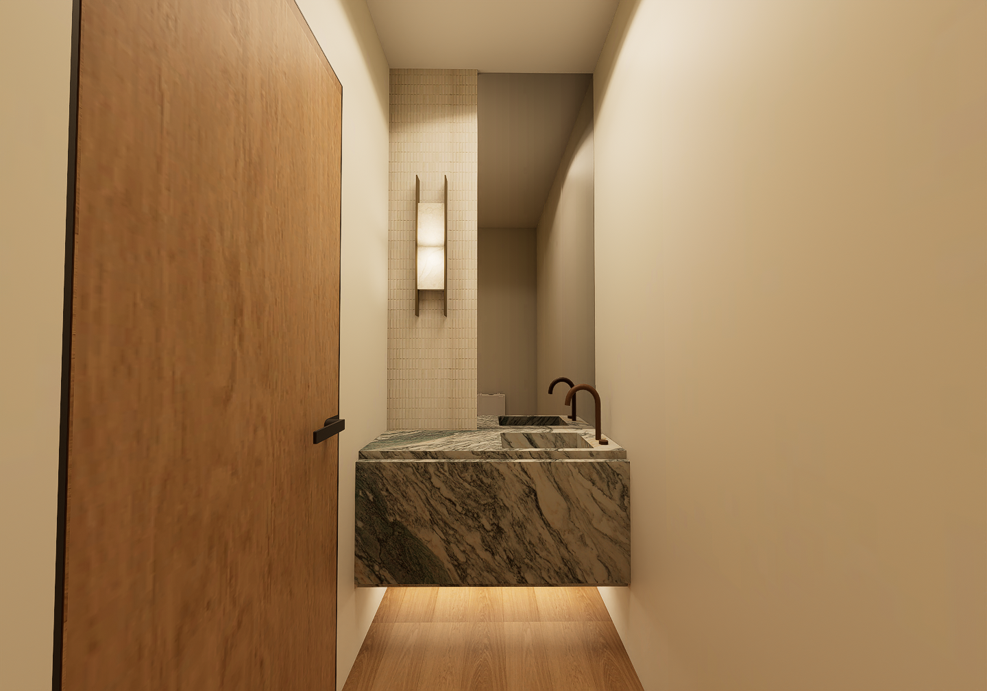 photorealistic interior render of a narrow modern powder room viewed from the entry showing extended depth of space maintain exact geometry layout proportions and all existing materials from the model with no alterations walls finished in warm creamy off white roman clay plaster with subtle texture feature wall at the back clad in vertically stacked small format textured tile in a light neutral tone floating monolithic stone vanity in heavily veined marble with bold organic veining featuring a refined eased edge profile at the top surface visible horizontal edge detail integrated rectangular sink wall mounted faucet in dark aged bronze finish visible and positioned over the sink tall narrow frameless borderless mirror mounted above vanity vertically aligned and reflecting the depth of the space vertical sculptural wall sconce centered on tile feature wall with a rectangular stone or plaster backplate and slim dark metal side supports emits a soft diffused warm glow 2700k minimal flat panel wood door with warm natural tone and dark hardware visible on left side in foreground light natural wood flooring with matte finish extending into the space lighting is soft warm and moody powder room ambiance hidden recessed ceiling lighting not visible with the wall sconce as the primary visible light source no additional fixtures emphasize soft shadows depth and realistic light falloff along the corridor like space slight gradient darkening toward the back wall for depth no overexposure no harsh highlights camera positioned slightly back in the doorway at human eye level 5 ft angled slightly to capture the length of the room subtle wide angle lens approx 24 28mm equivalent with minimal distortion materials must appear highly realistic with accurate scale micro texture and subtle imperfections no added decor no styling objects no redesign of any elements style high end architectural digest minimalist warm refined moody