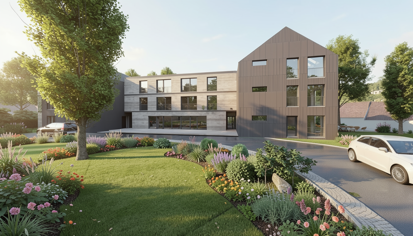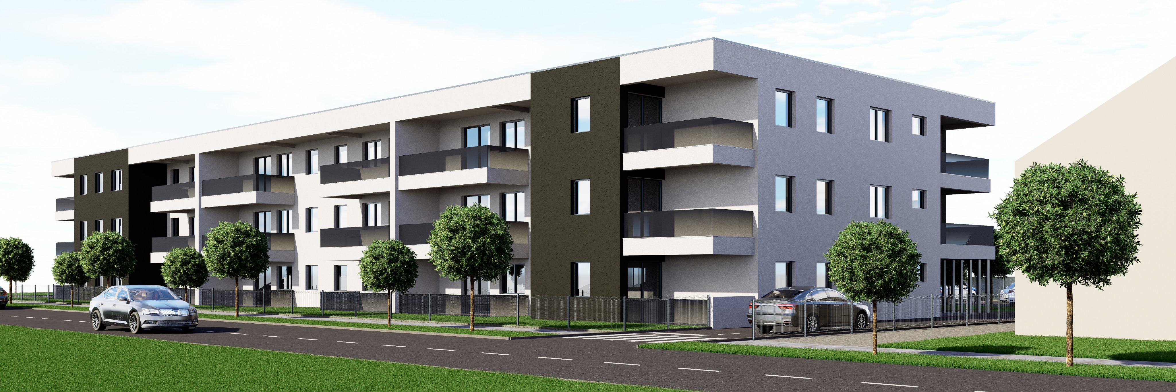 render a modern three story apartment building with a sleek design use a combination of light gray and dark charcoal gray for the exterior walls for a stylish contrast incorporate large windows reflecting the sky adding a sense of openness design the balconies with dark charcoal glass reflective railings and light gray surfaces surround the building with lush green lawns neatly trimmed the road in front should be a smooth asphalt with white markings set the atmosphere to a clear bright day with a vivid blue sky scattered soft clouds and gentle sunlight illuminating the scene add a luxury car driving away from the camera and seen from behind have people walking in front of the building on the pedestrian crossing a mother pushing a stroller with a baby a boy walking a dog and have the people spaced out a bit so they are not all clustered together keep the trees from the original model just enhance them a bit to be realistic the render should be ultra realistic