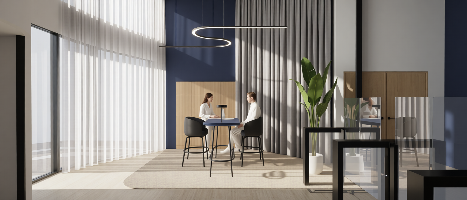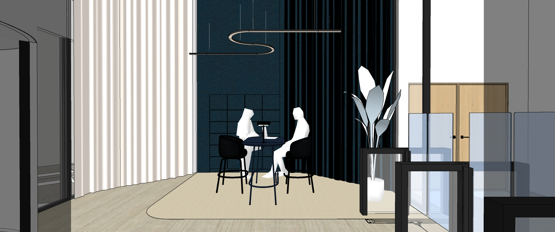 a modern interior space featuring a cozy seating area with sleek black chairs around a dark blue table the backdrop is a dark navy blue accent wall with deep blue panels adding warmth and contrast on the left elegant floor to ceiling curtains in a deep blue create a sense of openness on the left translucent beige curtain soft ambient lighting with a contemporary curvy overhead fixture casts gentle shadows enhancing the tranquil and sophisticated atmosphere the neutral toned floor and clear partitions complete the minimalist design big plant