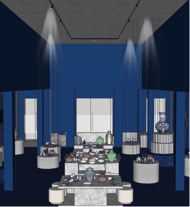 ceramic store blue carpet blue walls track light with spotlights for displays stainless steel displays central marble table