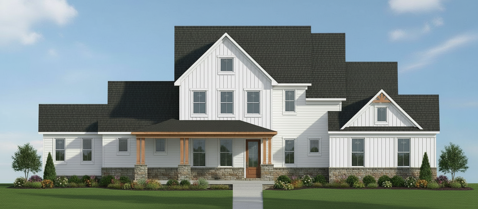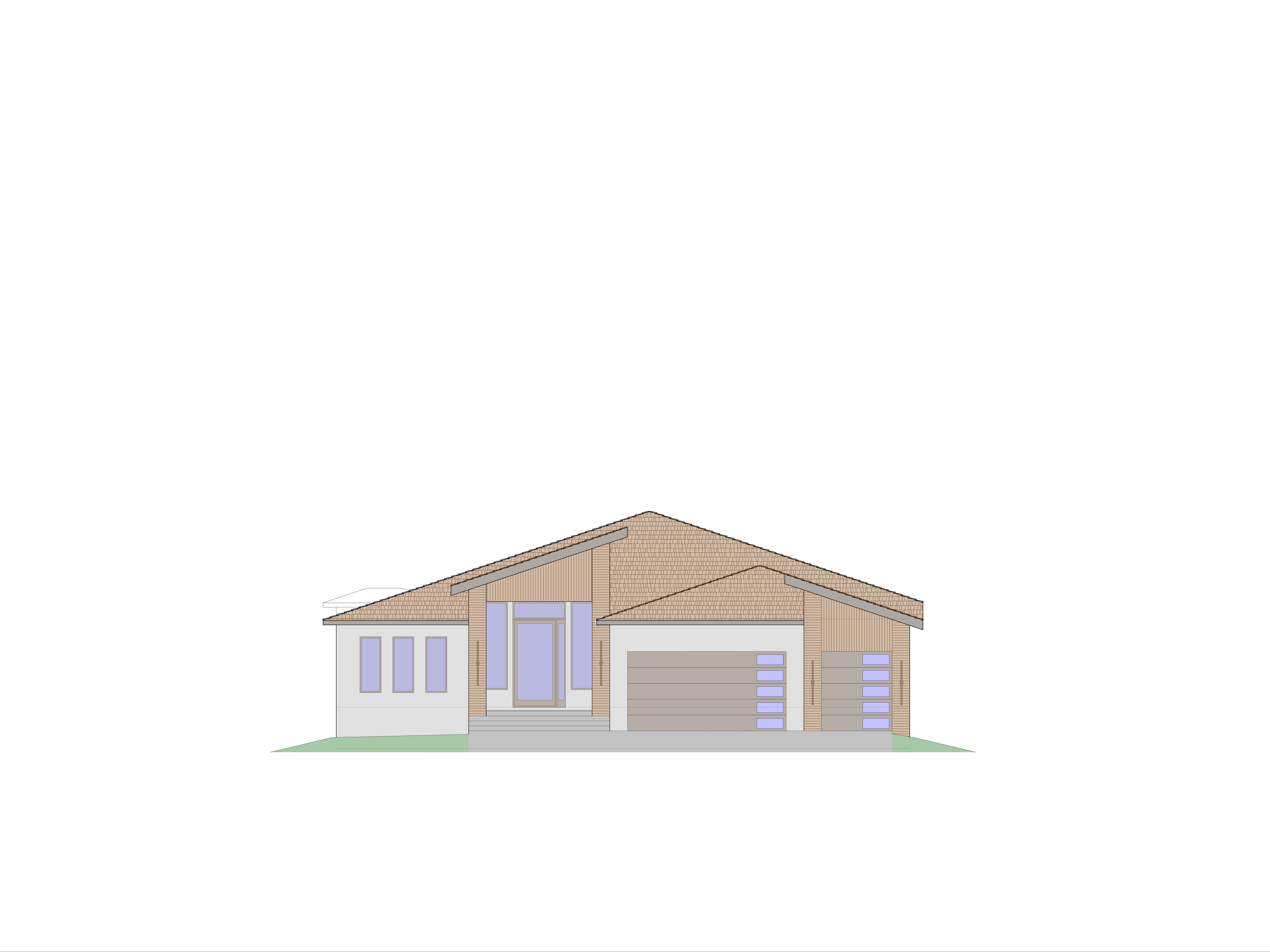dark brown flat tile roof white house color dappled brown stone wood grain garage doors dark brown vertical wood planks dappled brown paver driveway and walk to entry tropical landscape with blue sky and white clouds