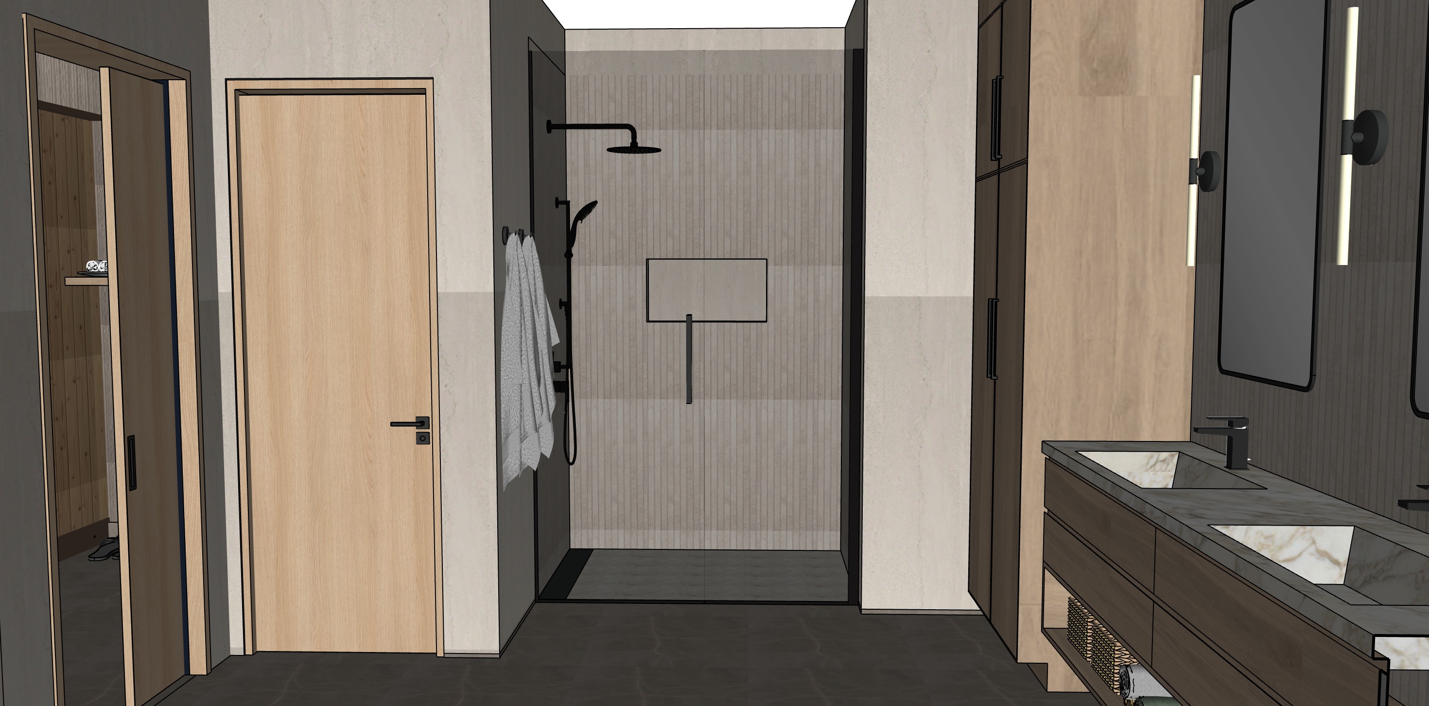 white oak wood stone fluted texture on shower walls large format stone on other walls brighten room soft lighting in the cove in the shower with shampoo bottles