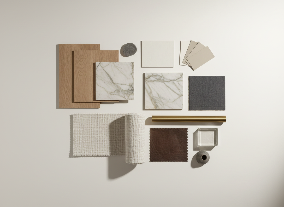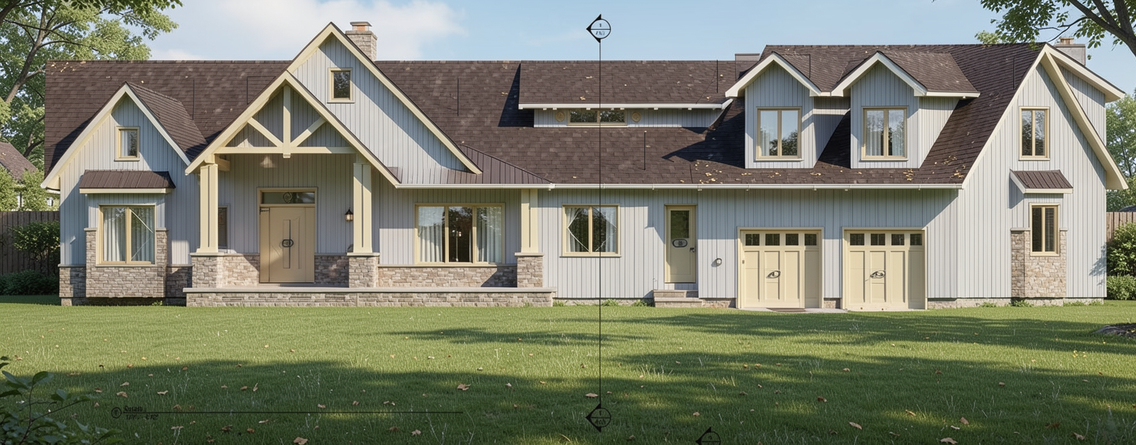siding is a very light gray windows are dark putty roof is dark brown garage doors and front door and pillars are medium brown wood