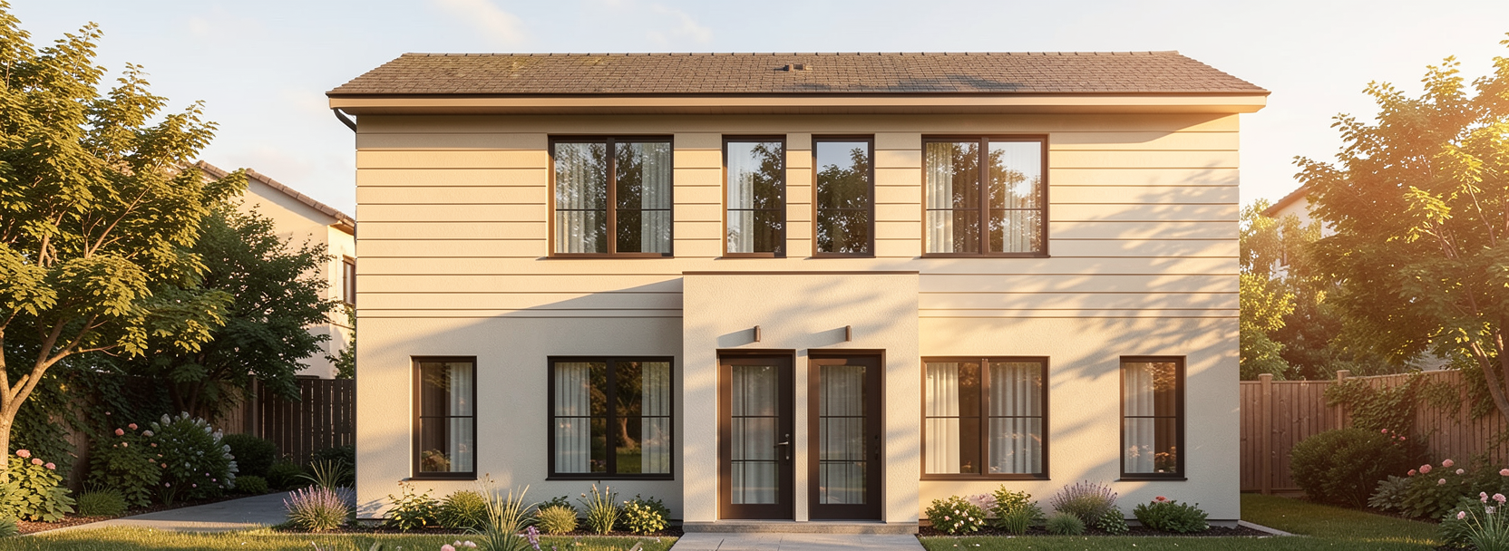 black frame picture windows off white stucco siding on first level hardie siding on second level 4k render no grilles in windows