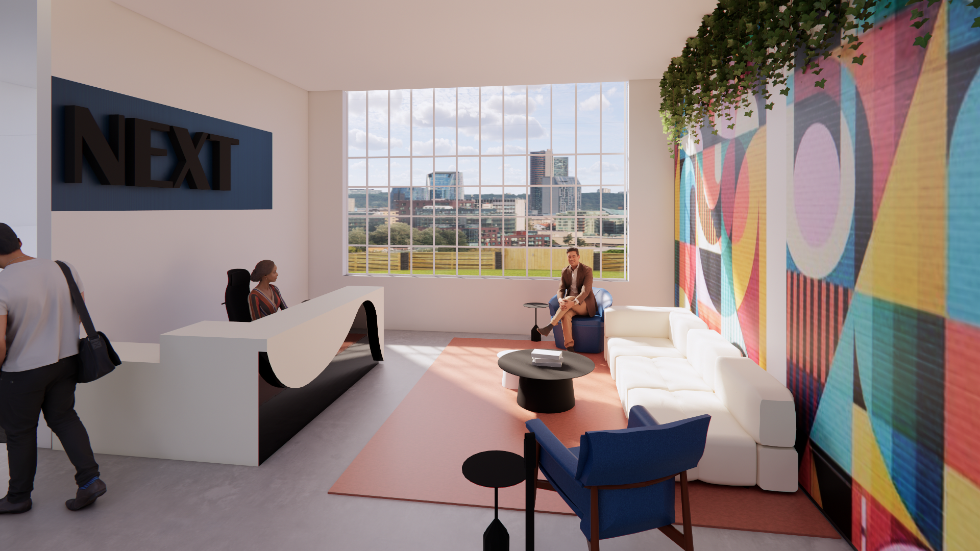 create a photo realistic render of this lobby exactly the way it is and the same angle the only thing that i want changed is i want a teracotta open ductwork ceiling and black pendant lights spread randomly on the ceiling