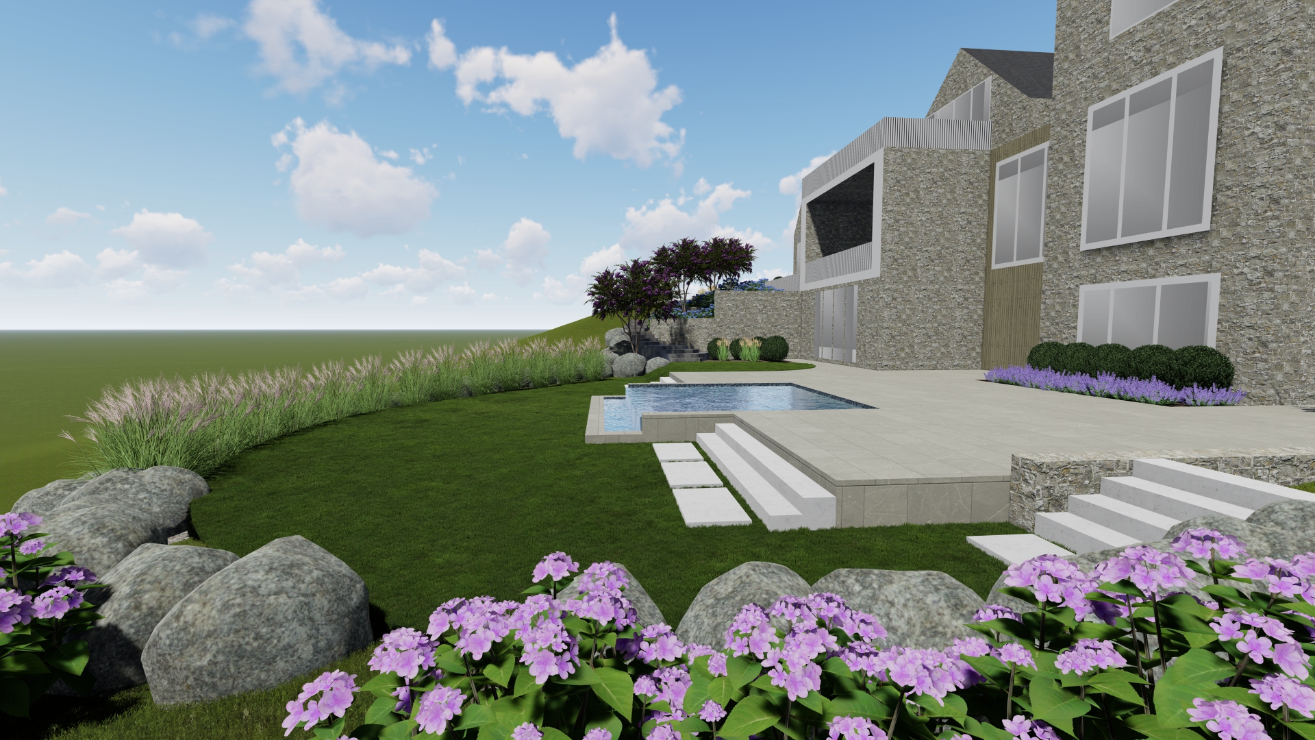 add trees to the background make grass more realistic make the sun setting make the house materials and windows look more realistic