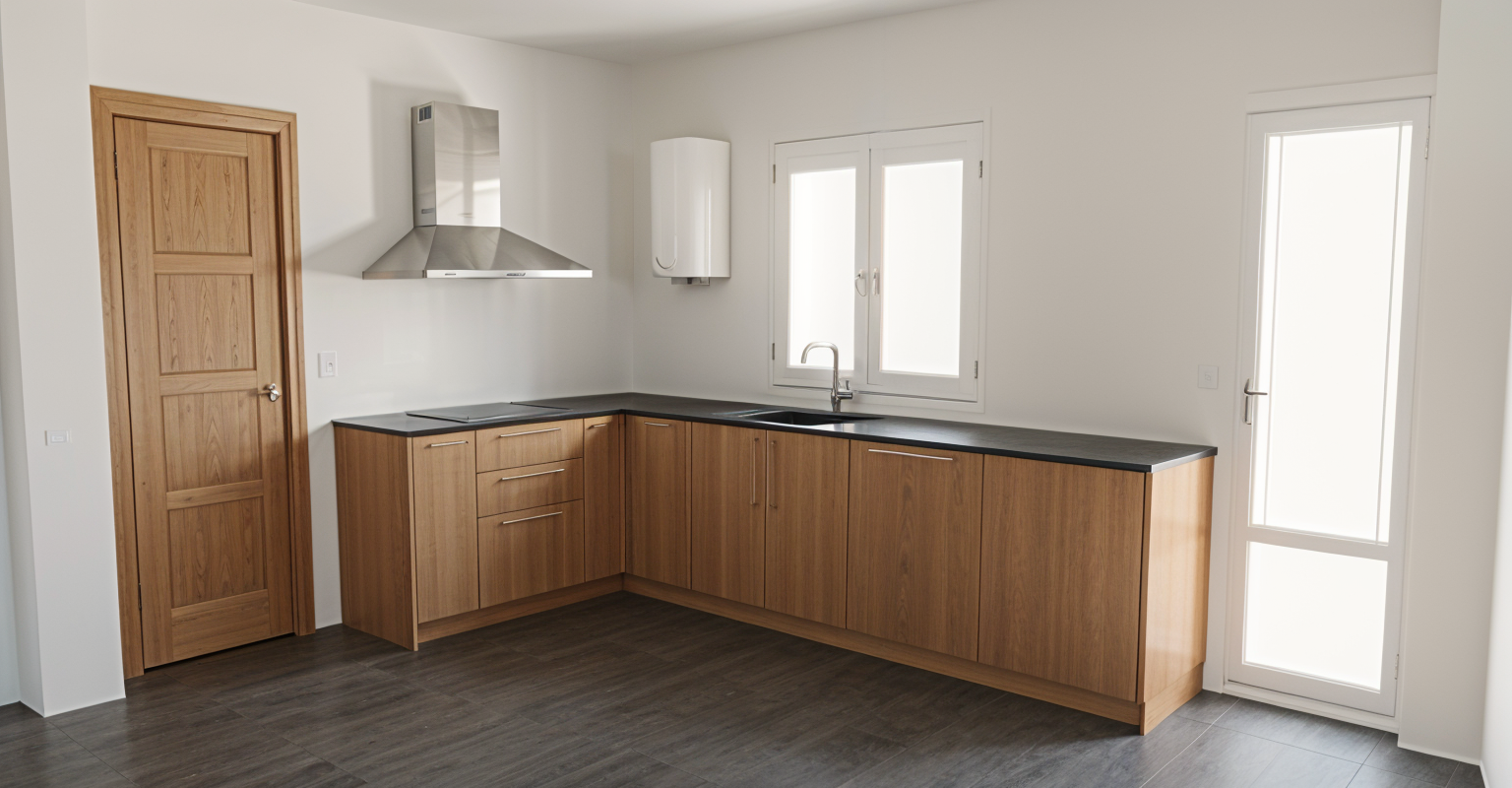 cocina en color madera roble natural encimera de granito negro mate campana en acero fregadero y grifo en acero suelo porcel nico en acabado cemento oscuro paredes en blanco pintadas a ade un termo de agua a la izquierda de la campana el termo es de 100 litros redondo