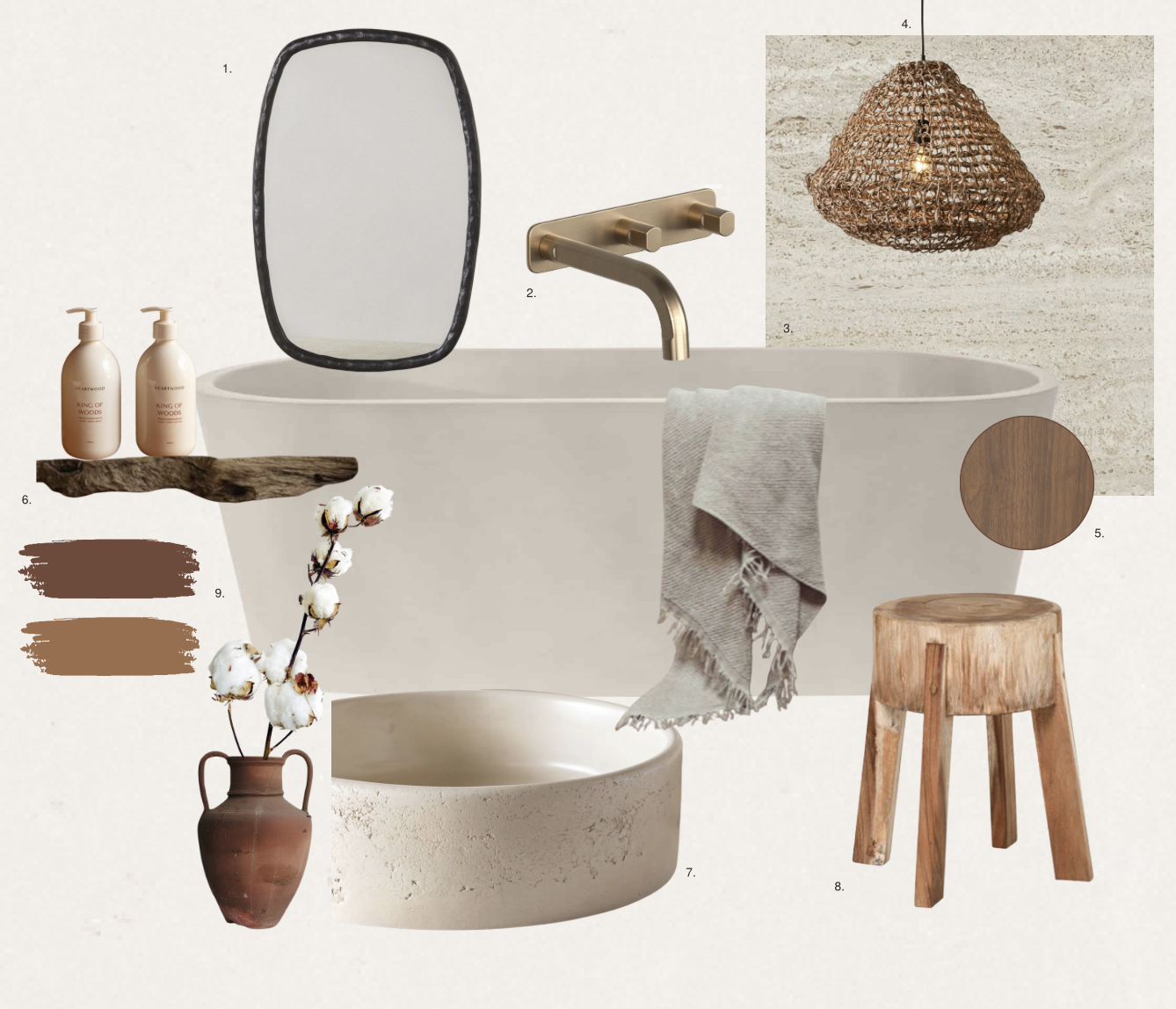 natural tones modern timber vanity travertine tiles and brass taps soft lighting timber beams on ceiling