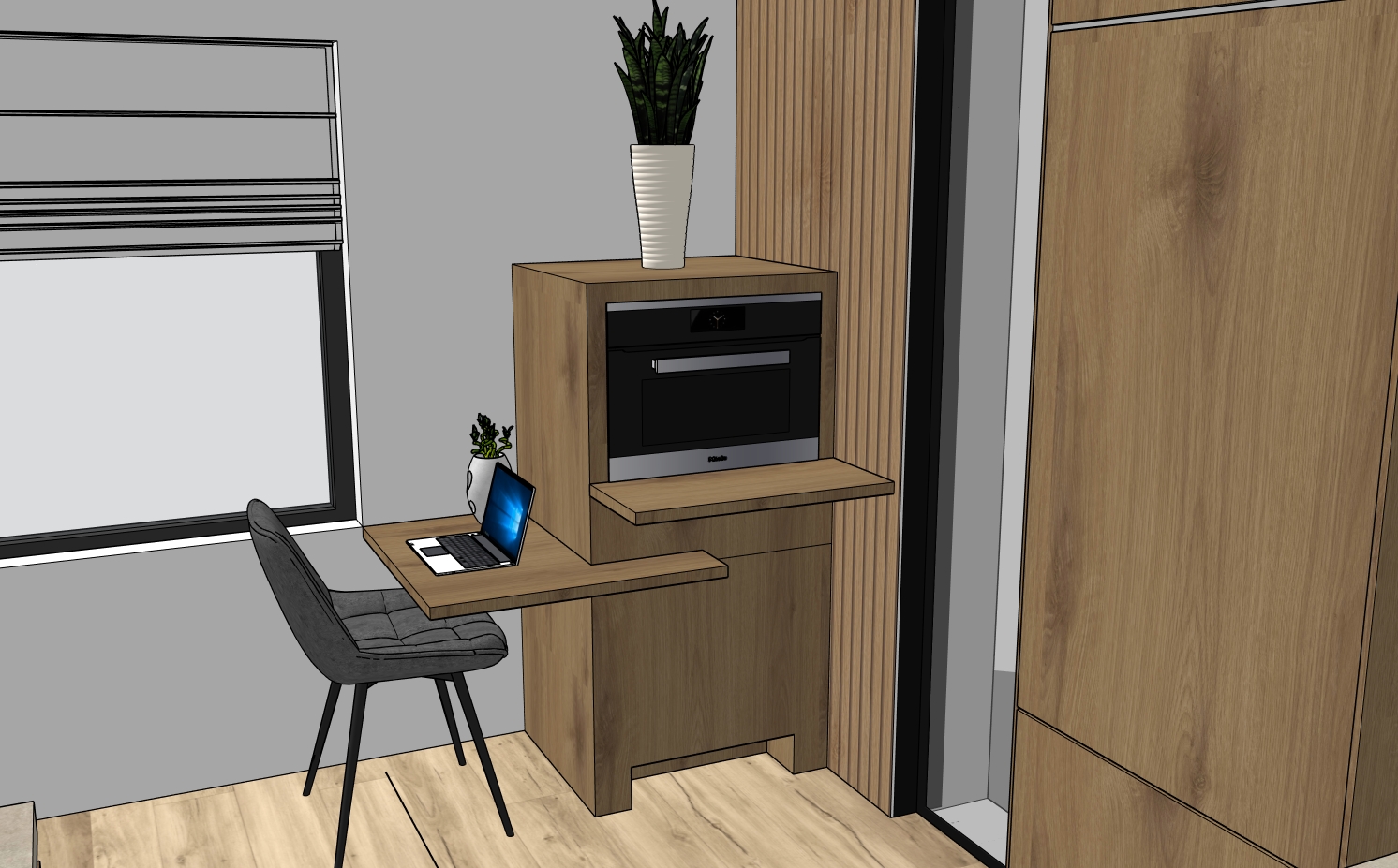 the same modern kitchen with warm inviting atmosphere use earthy tones on wooden cabinets dark oak wood for the table and cabinets add soft white pendant lighting with subtle gold accents casting a gentle glow the walls should be creamy white include dark gray fabric for bar stool seating accent with lush green indoor plants incorporate a sleek black faucet and appliances floor in light oak wood for a cohesive natural look