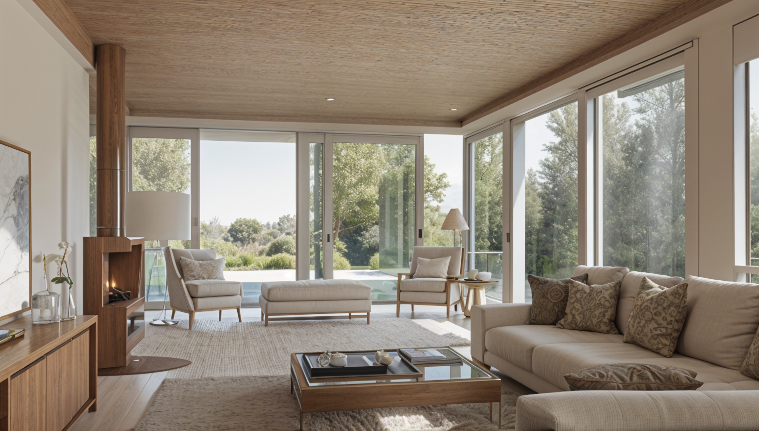 modernist exterior shot modern classic livingroom with big luxury furniture light beige and brown furniture with pillows in classic patterns pattern wall paper deep wood in table architecture