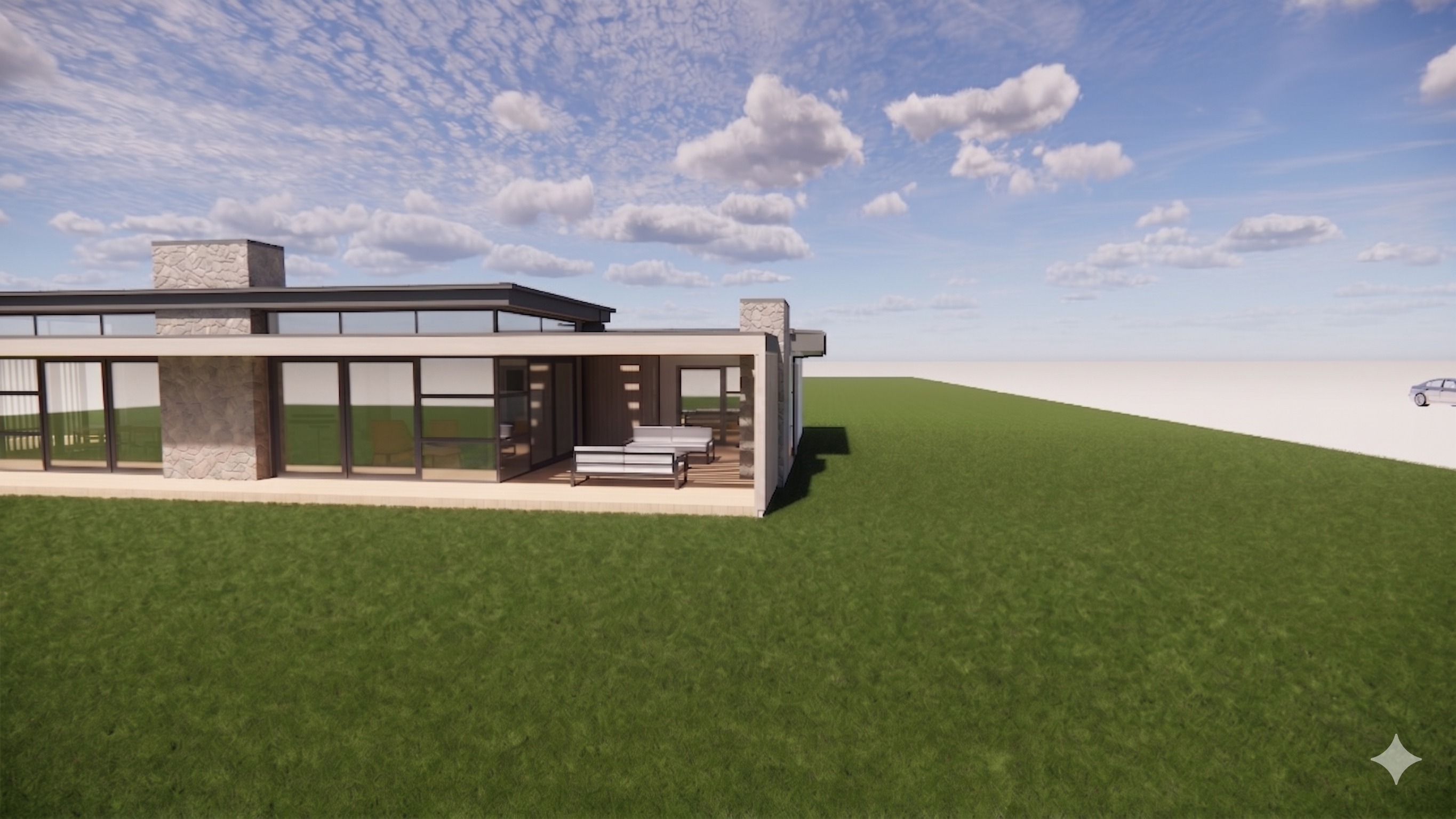 modernist exterior shot edit this image while keeping the house architecture exactly the same do not change the building design structure window placement or proportions recompose the image to improve visual balance crop in closer to the house so it becomes the clear focal point reduce the empty lawn in the foreground and right hand side centre the composition more around the main living fa ade and outdoor area maintain a realistic perspective without distorting the building improve the setting to feel like a premium new zealand residential environment replace the empty background with a subtle realistic landscape such as neighbouring sections soft tree lines or a gentle natural backdrop avoid coastal or beachfront scenery add refined new zealand landscaping structured planting beds near the house using flax phormium grasses and low native shrubs one or two small feature trees placed thoughtfully not blocking the house keep the lawn clean and controlled not oversized or empty apply a landmark homes visual style warm natural lighting with soft shadows slightly richer material tones especially timber and stone clean high end but realistic finish not overly stylised ensure the house remains the hero of the image with landscaping and environment supporting it not dominating it architecture