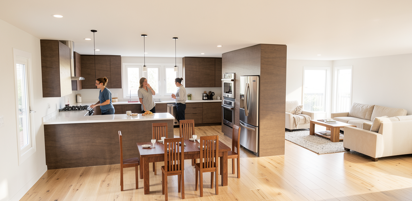 make it real and include people in the kitchen and living room with light colored wood flooring remove the plants in the background