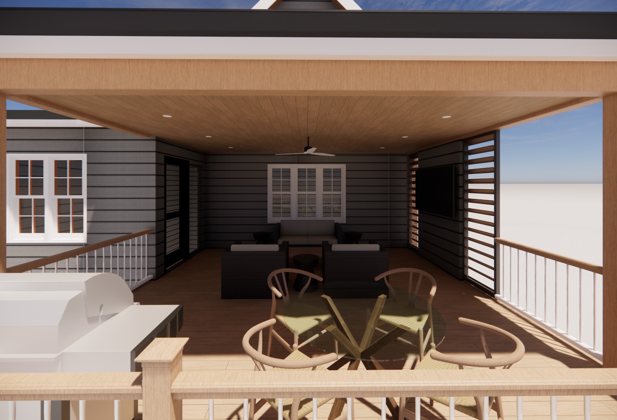 sky with pink and purple hues add simple ceiling lights at porch ceilings on add area rug under couch seating area place picture on tv screen add people