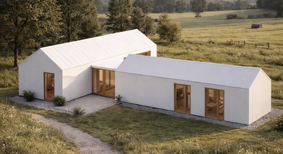 change the siding and roofing to vertical black steel on all buildings
