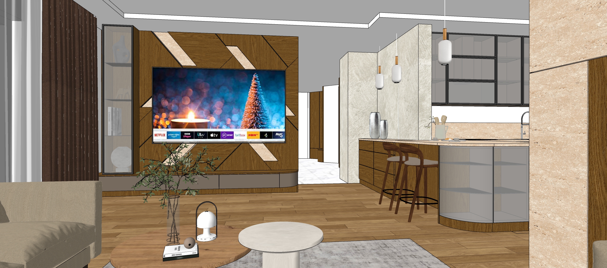 elegant living room with tv commode and vertical element with glass door from the left side of the tv behind that glass door led light under the shelves inside behind tv is decorative wall with medium dark oak wooden panels with different direction of wooden lines there is travertine parts elements in diagonal form put led lihgt behind wooden panel and in front of the travertine diagonal parts to make diffuse ambient light floor parquet oak seamless in honey color kitchen modern with travertine stone working top and same stone on the wall between kitchen elements but to half of the height kitchen breakfast area is rounded on the corners two wooden chairs there under the rounded part is glass rounded doors put some plates and glasses and decoration inside that element behind the glass doors upper kitchen cabinets with glass with metal frame in anthracite color put led light in horizontal lines under the shelves inside the upper kitchen cabinets wall from the hallway and behind breakfast area painted with some decorative wall paint technique in white and just little grayish color preserve the architecture and layout architecture
