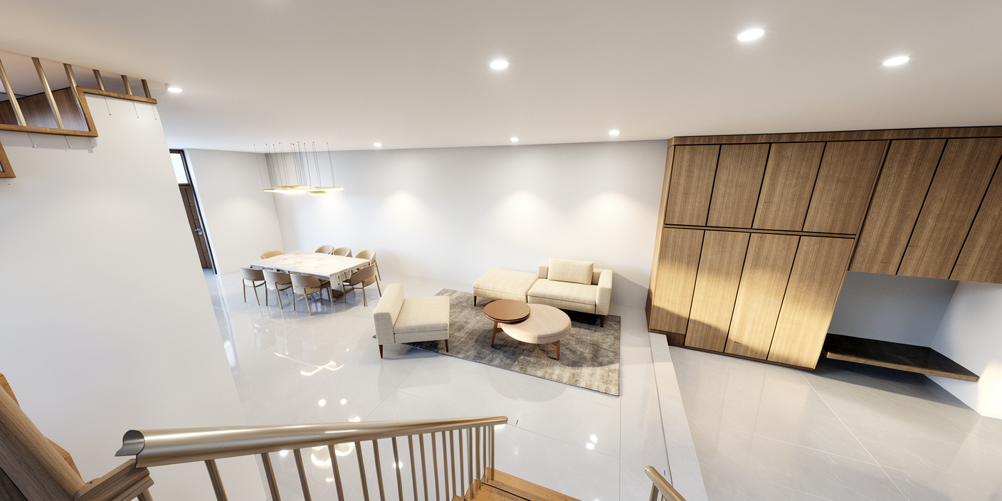 reflections with light atmospheric depth render in hyper realistic architectural visualization quality white downlights brighter white lights beige cream sofa soft taupe color carpentry wood railings not reflective