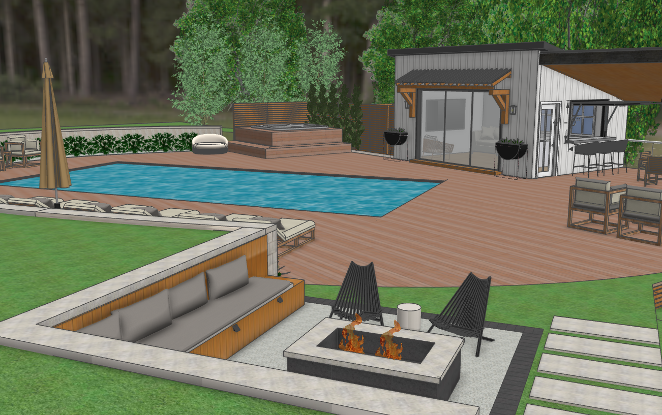 render a photorealistic 3d perspective of this house in lake geneva wi reference the current material style just enhance them remove the 4 trees between fencing ant hot tub remove pavers on the bottom right to grass create a step down from the decking to the grass below by the firepit create much taller trees behind the poolhouse and in the distance for the perspective to seem closer keep model geometry the same windows doors roof walls garage door lush vegetation that looks native to lake geneva wisconsin do not change the view only enhance the current materials and make the landscape nicer vegetation detailed textures in the wood siding and glass reflections and a vibrant clear sky with light atmospheric depth render in hyper realistic architectural visualization