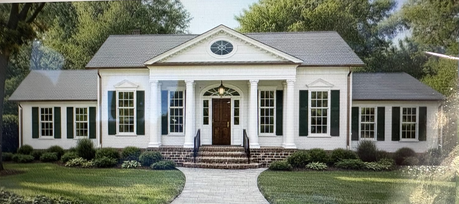 make the shutters a dark green black color make the roof a dark grey slate color make the pathway red brick with white mortar remove the gable pediments over windows add standing seam metal at front porch roof make the columns ionic capitals