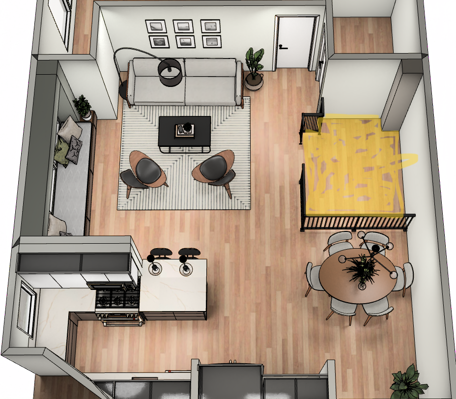 keep the wall white in the yellow part insert stairs to the floor below